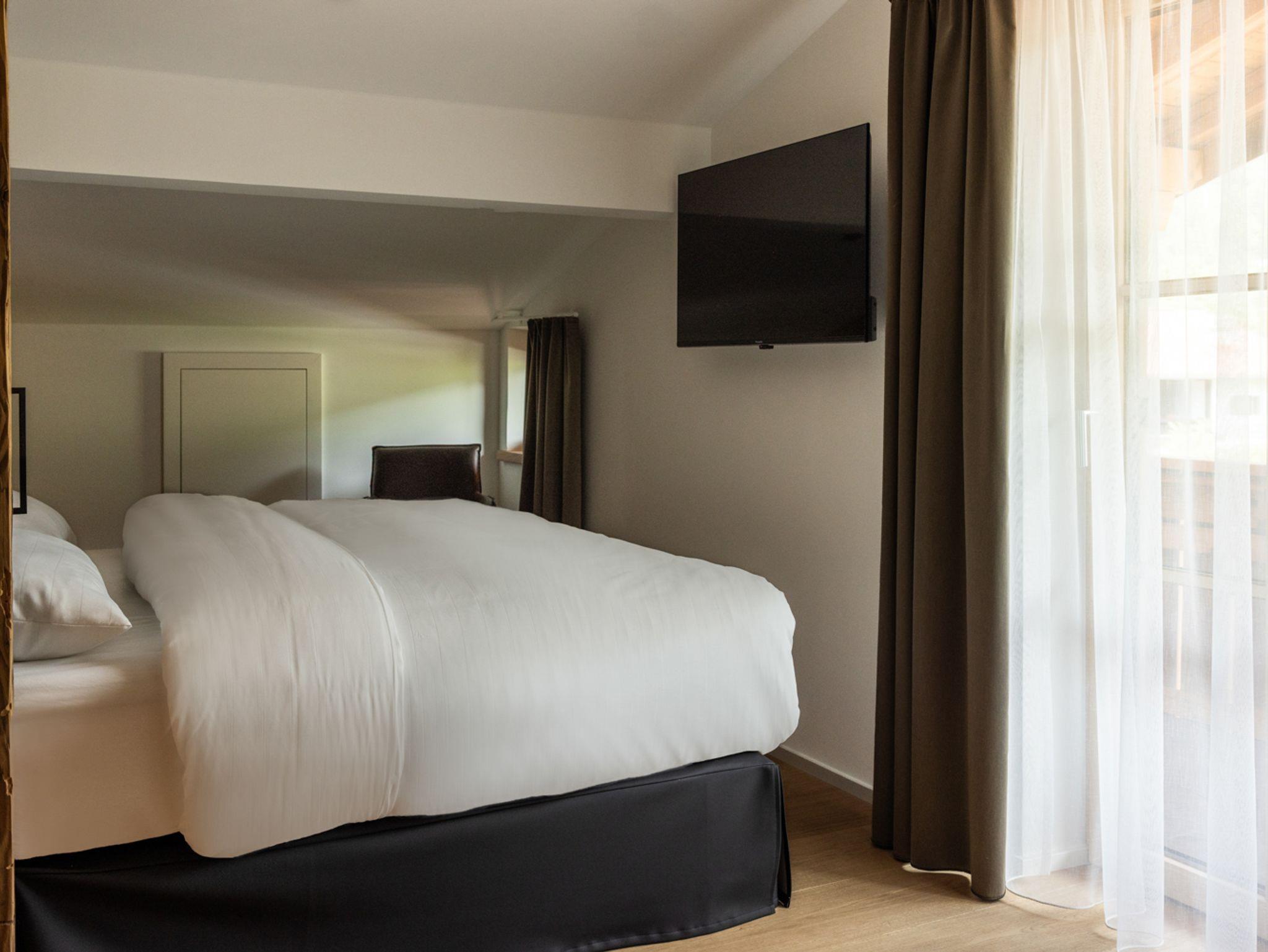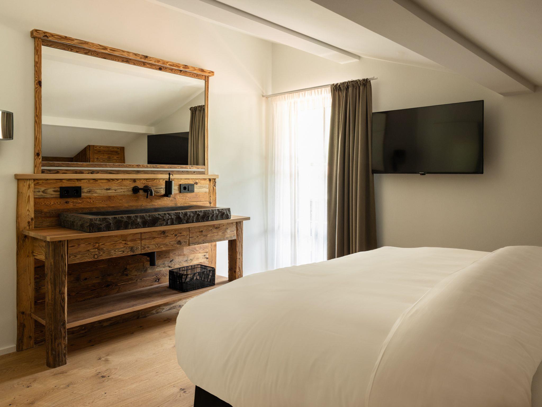 Schlafzimmer 1 mit Boxspring-Doppelbett, Schrank, Waschtisch, begehbarer Regendusche, schwenkbarem TV (digitaler Sat-Empfang), separatem WC