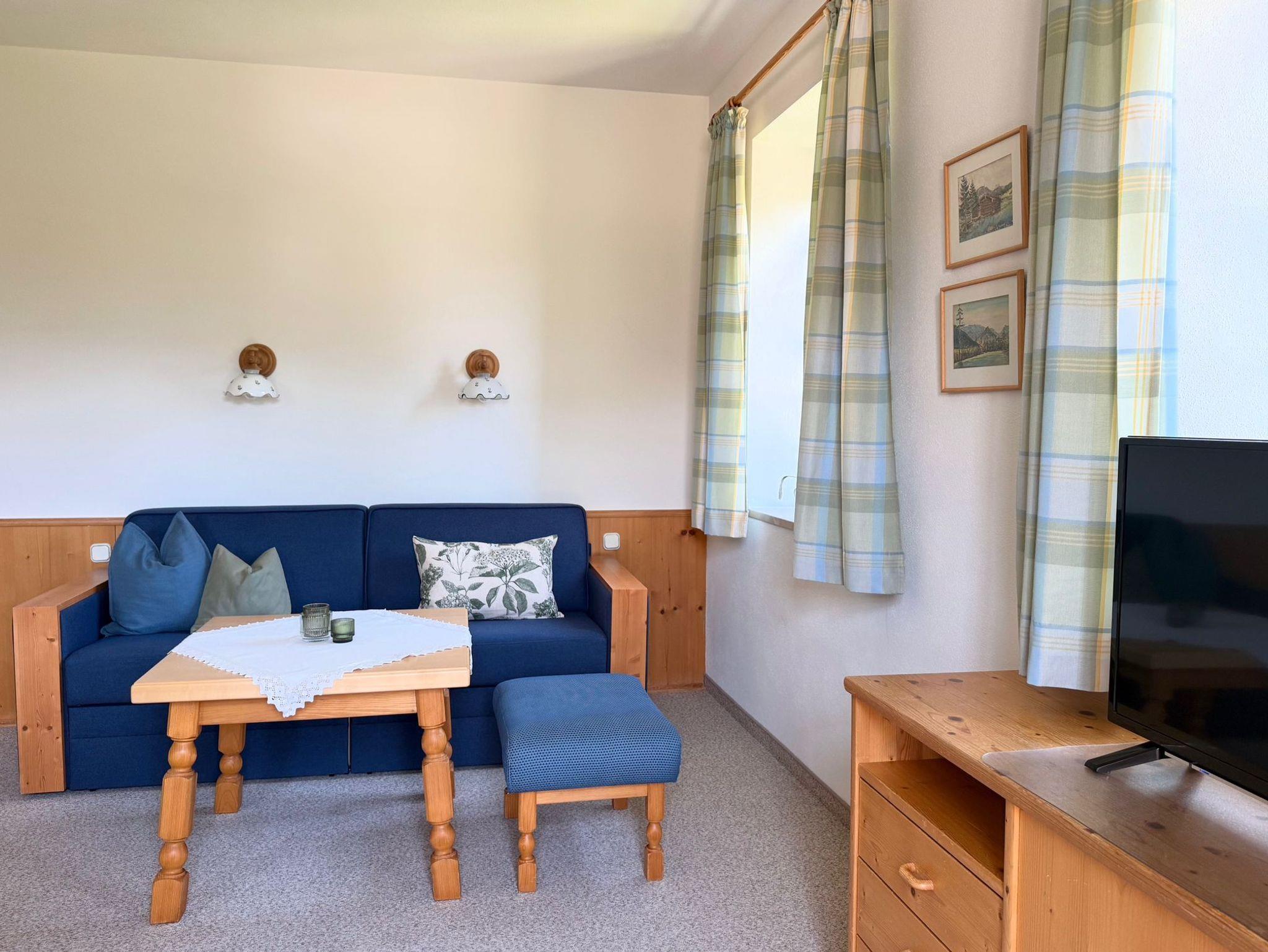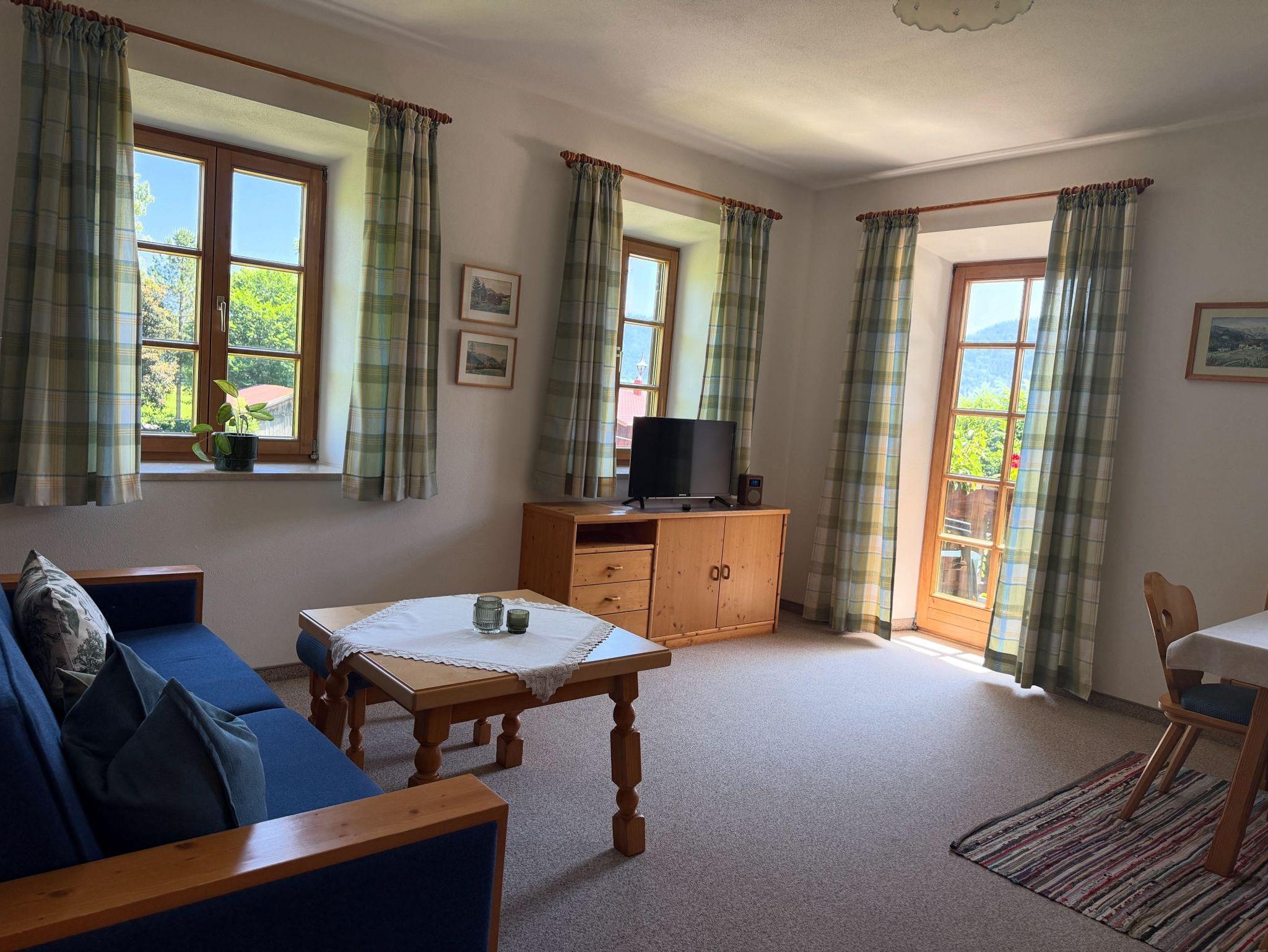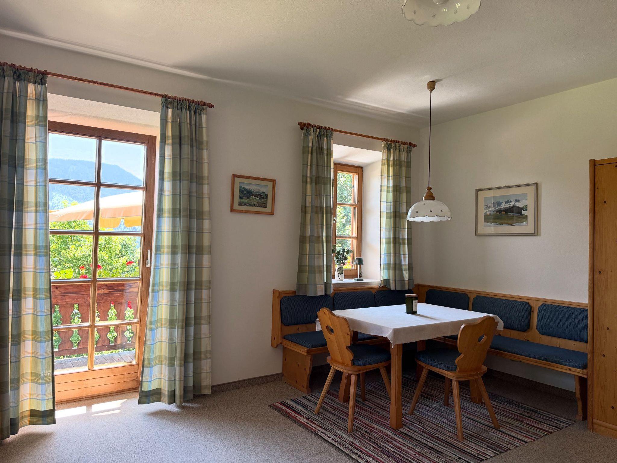 Das helle und großzügig geschnittene Apartment liegt im ersten Stock und verfügt über einen nach Süden ausgerichteten möblierten Balkon mit Bergblick auf Unterberg, Wilder und Zahmer Kaiser. Es ist für zwei Erwachsene oder eine Familie mit ein/zwei kleinen Kindern ausgelegt.