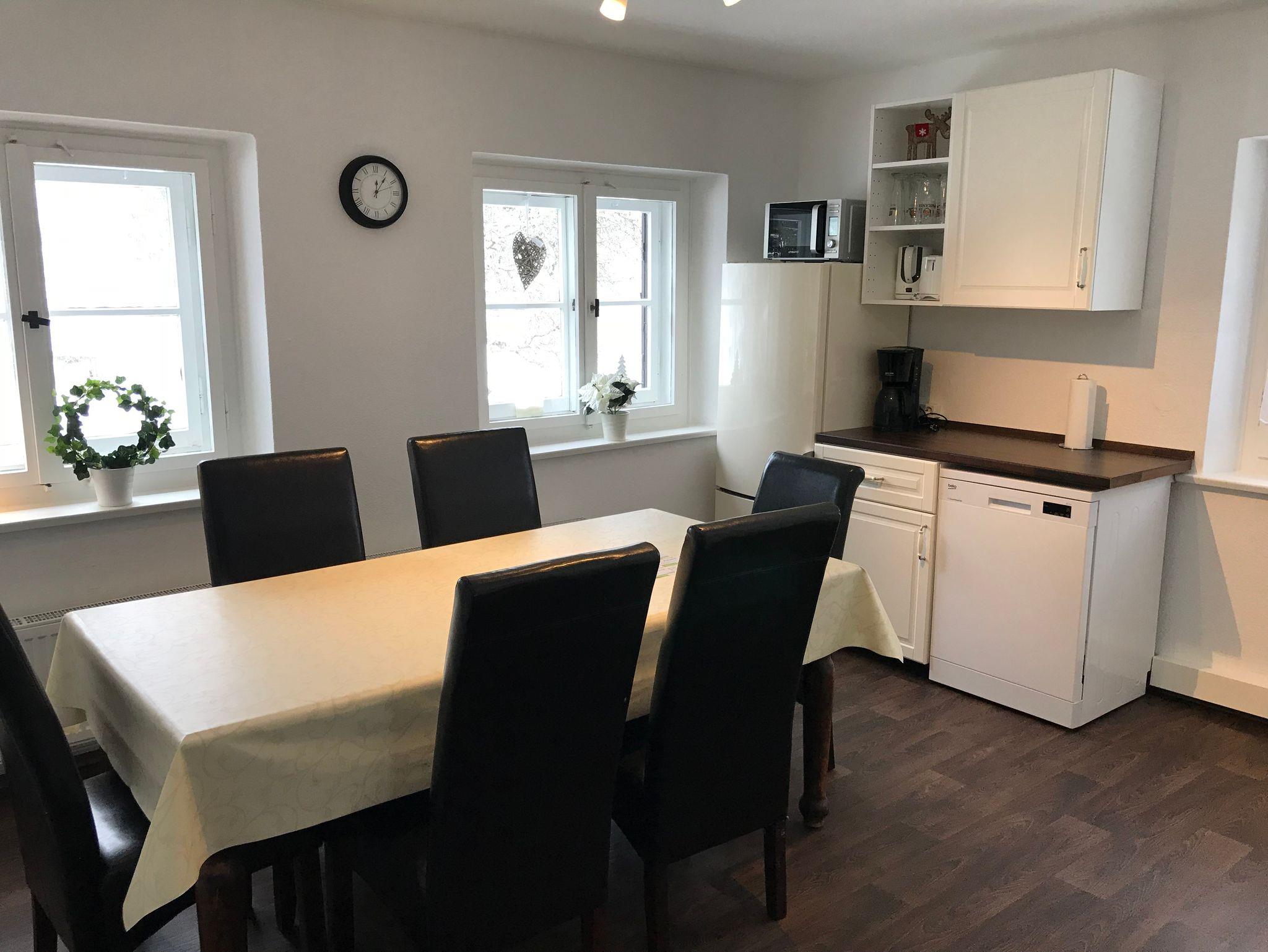 Die Wohnung liegt in einem Zweifamilienhaus im 1. Obergeschoss. Im Erdgeschoss befindet sich ebenfalls eine Ferienwohnung. Beide Wohnungen haben Zugang zum Garten mit eigenen Sitzecken, Gartenmöbeln und Grill im Sommer. Direkt vor dem Haus befinden sie die Privatparkplätze. Die Wohnung ist sehr geräumig, hat 3 Schlafzimmer, Flur, Bad mit WC/Dusche, große Wohnküche komplett eingerichtet und ein gemütliches Wohnzimmer mit eingenem Südbalkon mit Blick in die Natur.