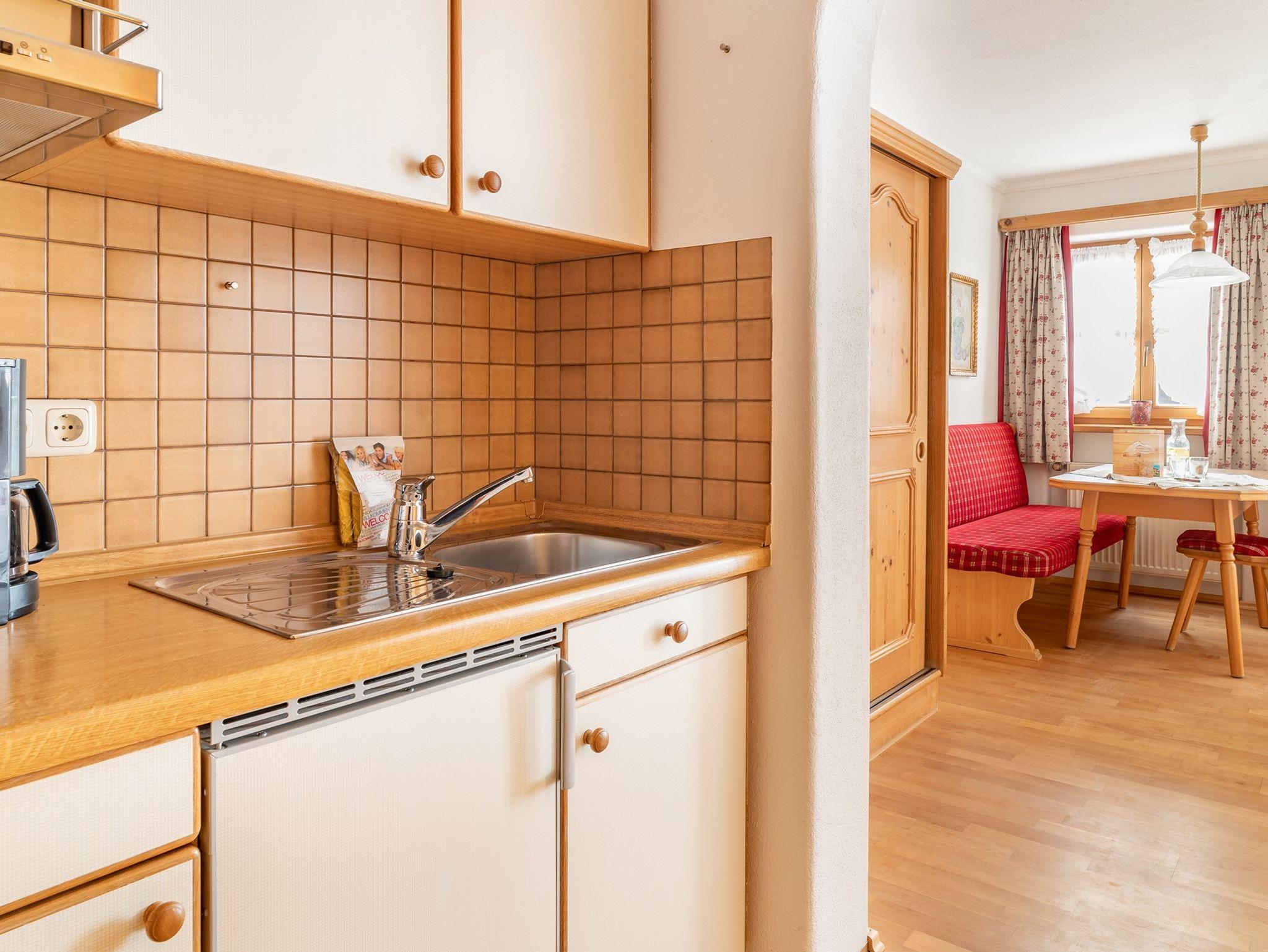 Gemütliches 1-Zimmer-Appartement mit Südbalkon, sonnig und ruhig mit freiem Blick auf die Berge. Kochnische komplett eingerichtet.
