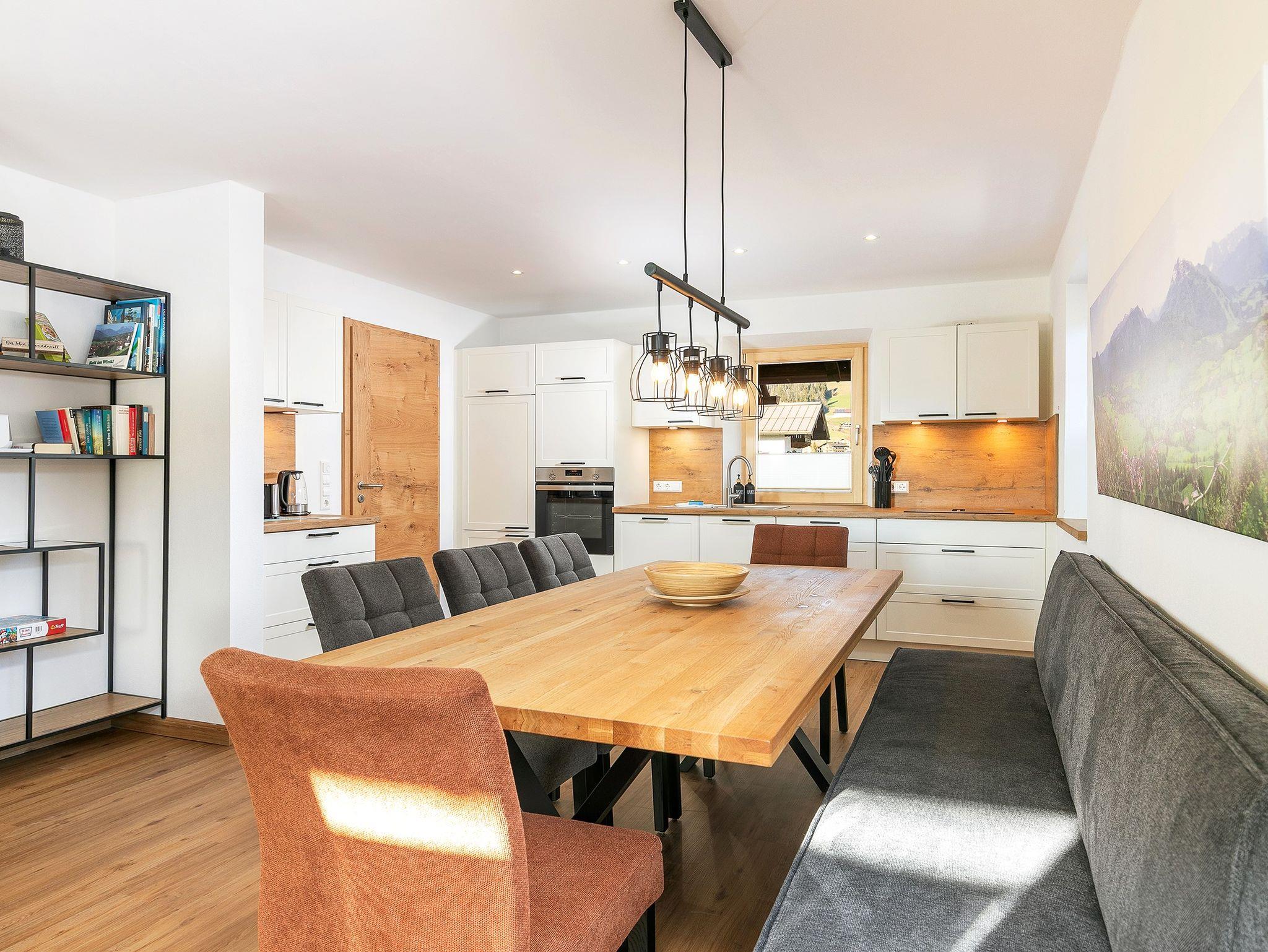 Die Küche ist ein wahres Highlight – voll ausgestattet mit hochwertigen Geräten, darunter ein Induktionsherd und ein Waschtrockner. Durch die vielen Fenster in der Wohnung strömt das natürliche Licht, was eine besonders einladende und warme Atmosphäre schafft. WLAN und ein Smart-TV sorgen für zusätzlichen Komfort, während Sie sich nach einem aktiven Tag in den Bergen entspannen können. Für Ihre Fahrräder oder Skier gibt es praktische Abstellmöglichkeiten.