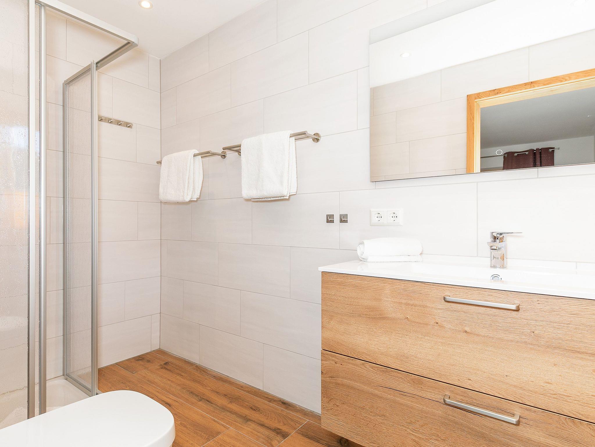 Mit ihren drei gemütlichen Schlafzimmern – zwei davon mit großzügigen 180 cm Doppelbetten, eines mit einem 160 cm Doppelbett – bietet die Wohnung Raum für bis zu 8 Personen. Ein Schlafzimmer ist mit einem eigenen Bad en suite ausgestattet, was zusätzlich für mehr Privatsphäre sorgt. Der großzügige Wohn- und Essbereich, in dem ein großer Esstisch und eine bequeme Couch zum Verweilen einladen, bietet einen Ort für gesellige Stunden oder entspannte Abende. Zwei moderne Bäder und ein Gäste-WC ergänzen den Komfort. Besonders verführerisch ist der große, möblierte Balkon, der zu jeder Tageszeit einen atemberaubenden Bergblick freigibt. Hier können Sie den Sonnenaufgang oder den Sonnenuntergang genießen – der Balkon ist sowohl vom größten Schlafzimmer als auch vom Wohnzimmer zugänglich und erstreckt sich nach Osten, Süden und Westen.