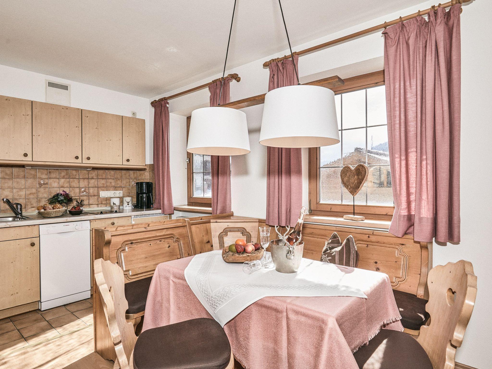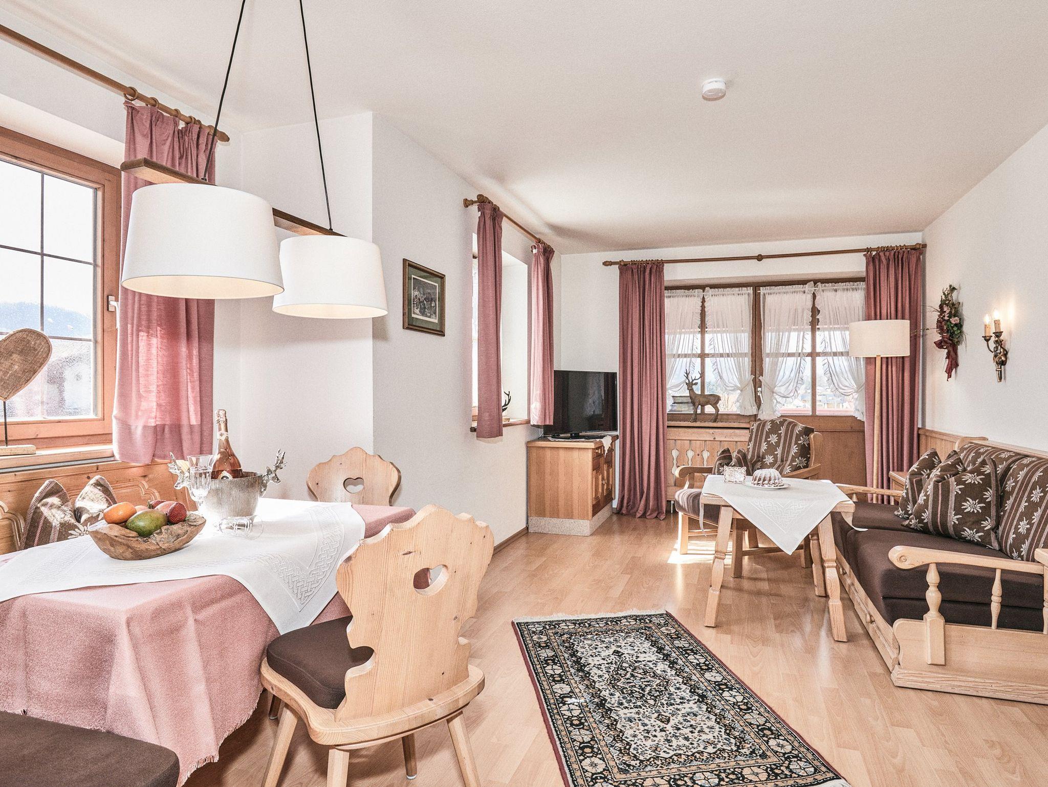 Schlafraum, Wohnraum, eingebaute Essecke, Sitzgruppe mit Tisch und komplett ausgestattete Küche, Flur, Badezimmer mit ebenerdiger Dusch, WC und Fenster. Balkon mit Blick zum Wilden Kaiser (Südseite).