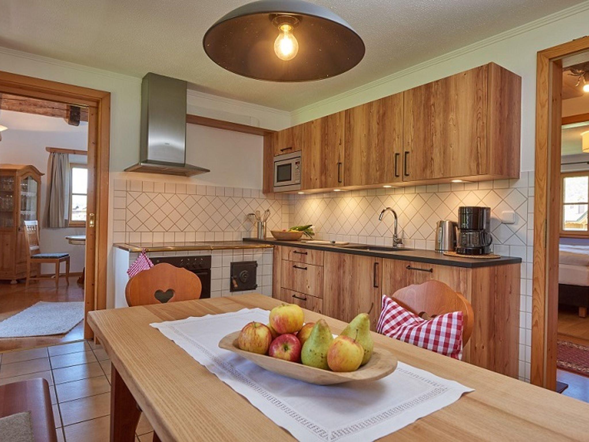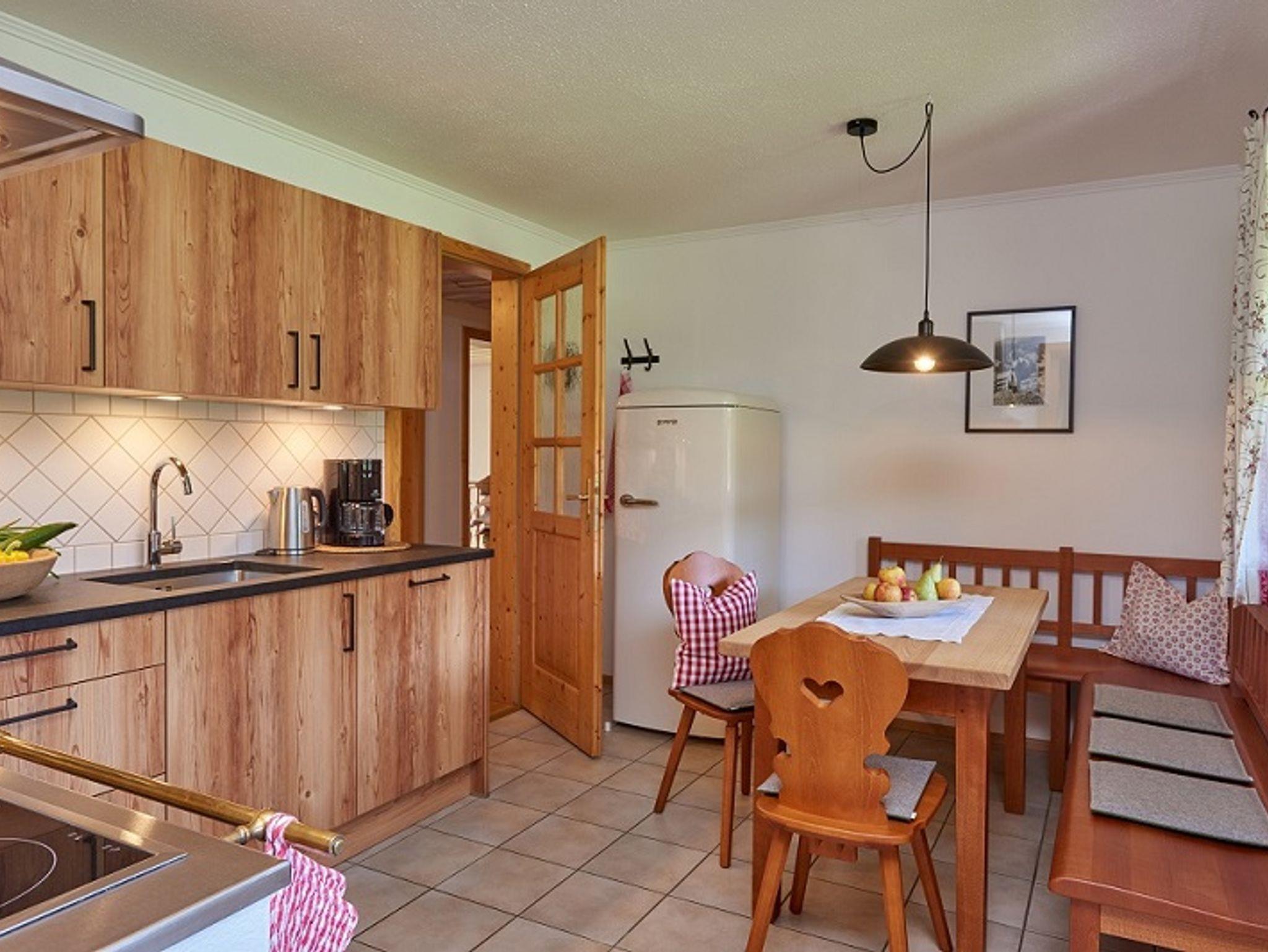 die großzügige Ferienwohnung hat eine Essecke in der Küche, sowie einen Essplatz im Wohnzimmer; Wohnzimmer mit gehacktem Sichtdachstuhl und Kachelofen mit Sitzbankerl;