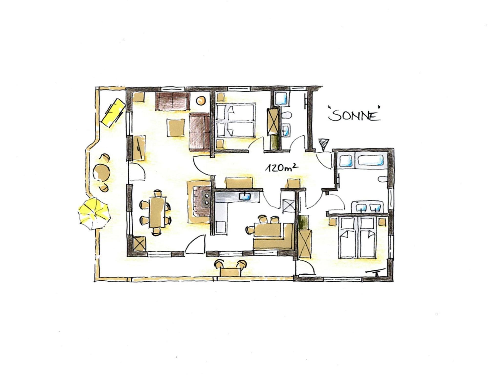Holzdielenböden und gekalkte Wände sorgen für ein besonders angenehmes Wohnklima. Im Untergeschoss finden Sie eine finnische Sauna mit Ruhebereich, sowie eine Waschküche mit Waschmaschine, Trockner, Bügelbrett, Bügeleisen etc. und einen Ski- und Schuhraum.