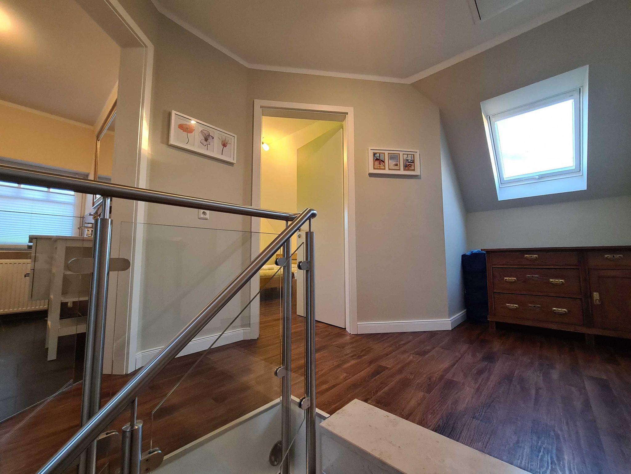 Obergeschoss: 1 Schlafraum mit Doppelbett, 1 Schlafraum mit zwei Einzelbetten (auch zusammenstellbar), Bad/WC mit Badewanne.