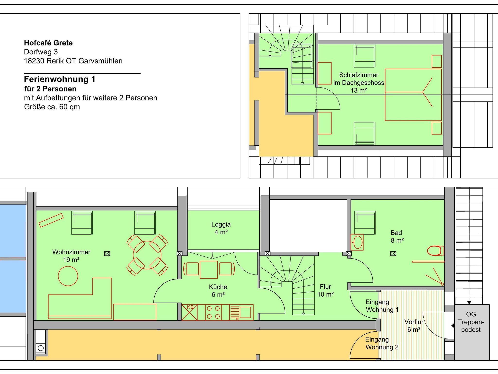 H3 Wohnen am Hofcafé mit Feierscheune Ostseebad Rerik, Nr.1/ 2-Raum-FeWo (rechts, 60m²) 2-4 Pers., Loggia, OG+DG