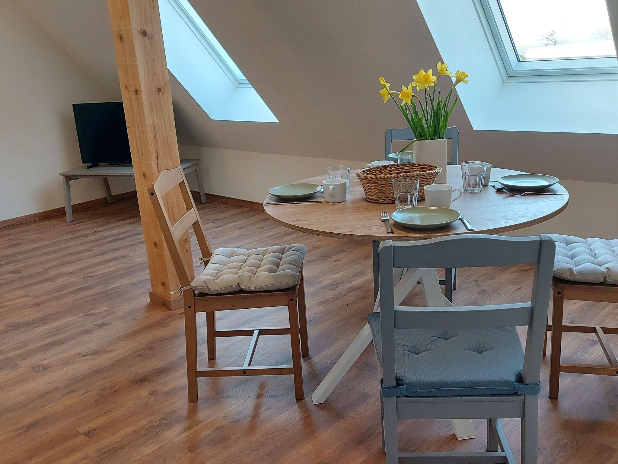 Liebevoll eingerichtete 1- und 2-Raum-Ferienwohnungen im Obergeschoss der modernisierten Scheune bieten nicht nur modernen Komfort, sondern auch einen schönen Wiesenblick. Die Möglichkeit, auf der Loggia, dem Balkon oder der Hofterrasse zu entspannen, rundet das Urlaubstag perfekt ab.