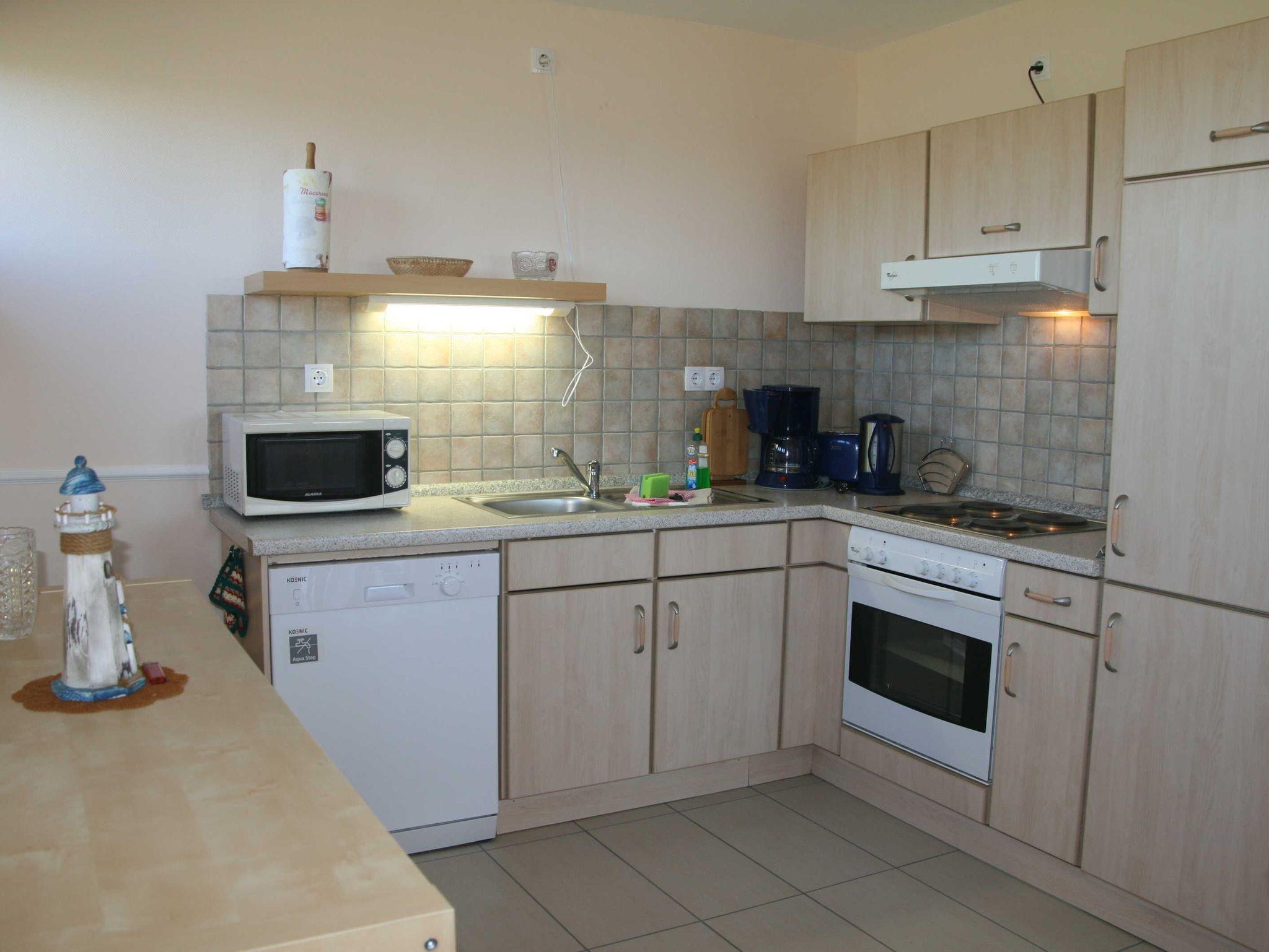 • Küche (Geschirrspüler, Mikrowelle, Wasserkocher, Toaster, Kaffeemaschine, 4-Platten-Herd, Backofen, Kühlschrank mit Gefrierfach)