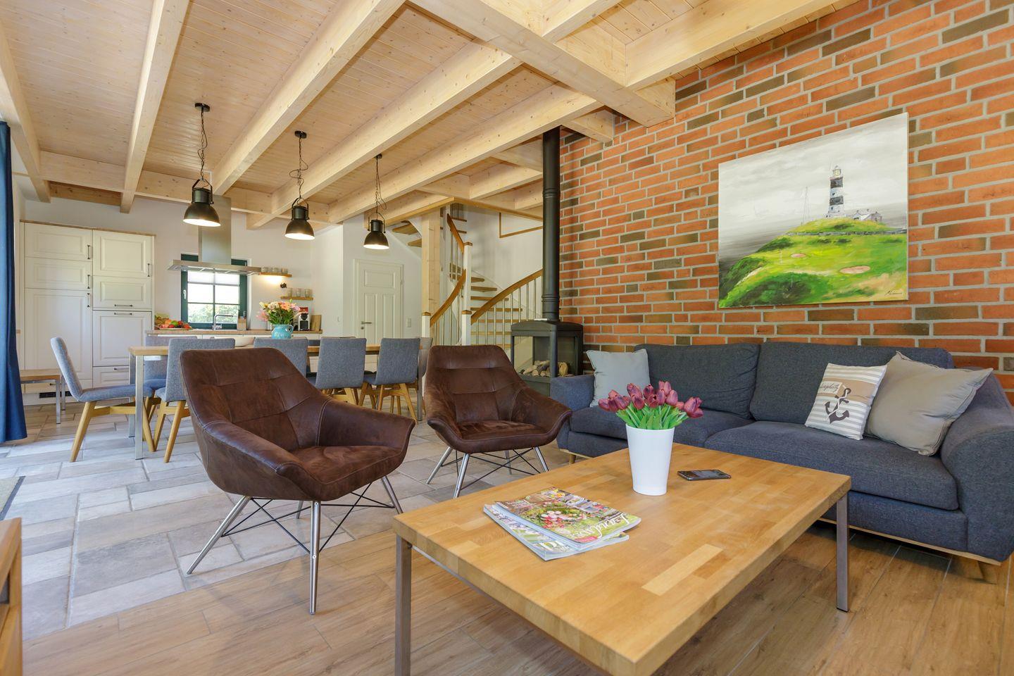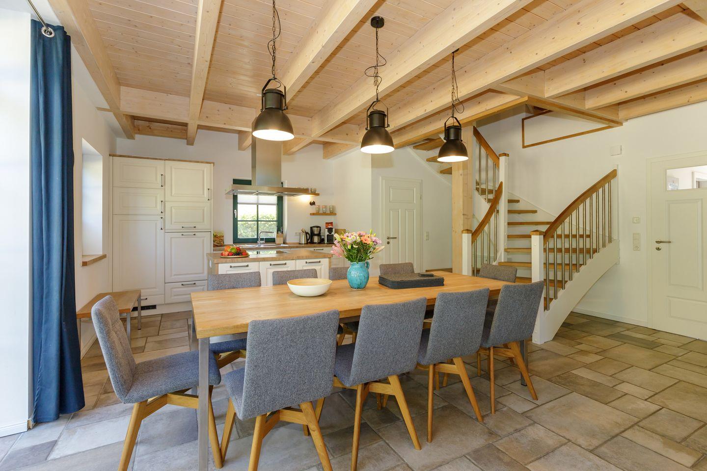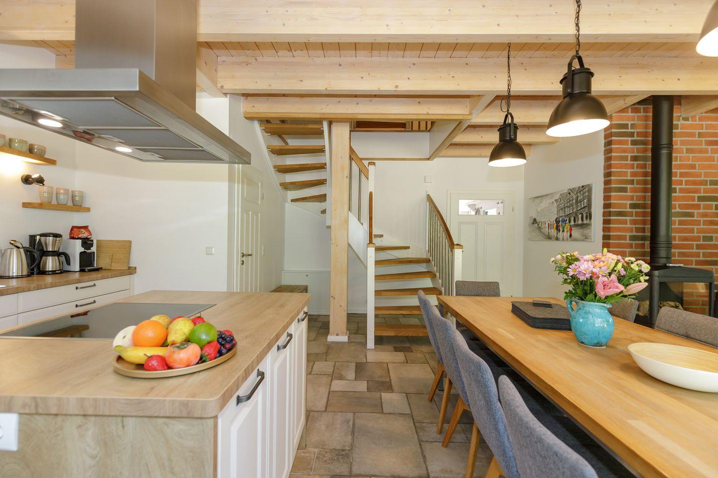 Der offen in das Wohnzimmer integrierte Küchenbereich ist hochwertig ausgestattet: Neben Herd, Backofen, großem Kühlschrank und extra Gefrierschrank stehen Ihnen eine Spülmaschine, Mikrowelle, Senseo-Espressomaschine, klassische Kaffeemaschine, Wasserkocher, Toaster sowie umfangreiches Koch- und Essgeschirr zur Verfügung. Ein großzügiger Esstisch laden zu gemeinsamen Mahlzeiten ein.
