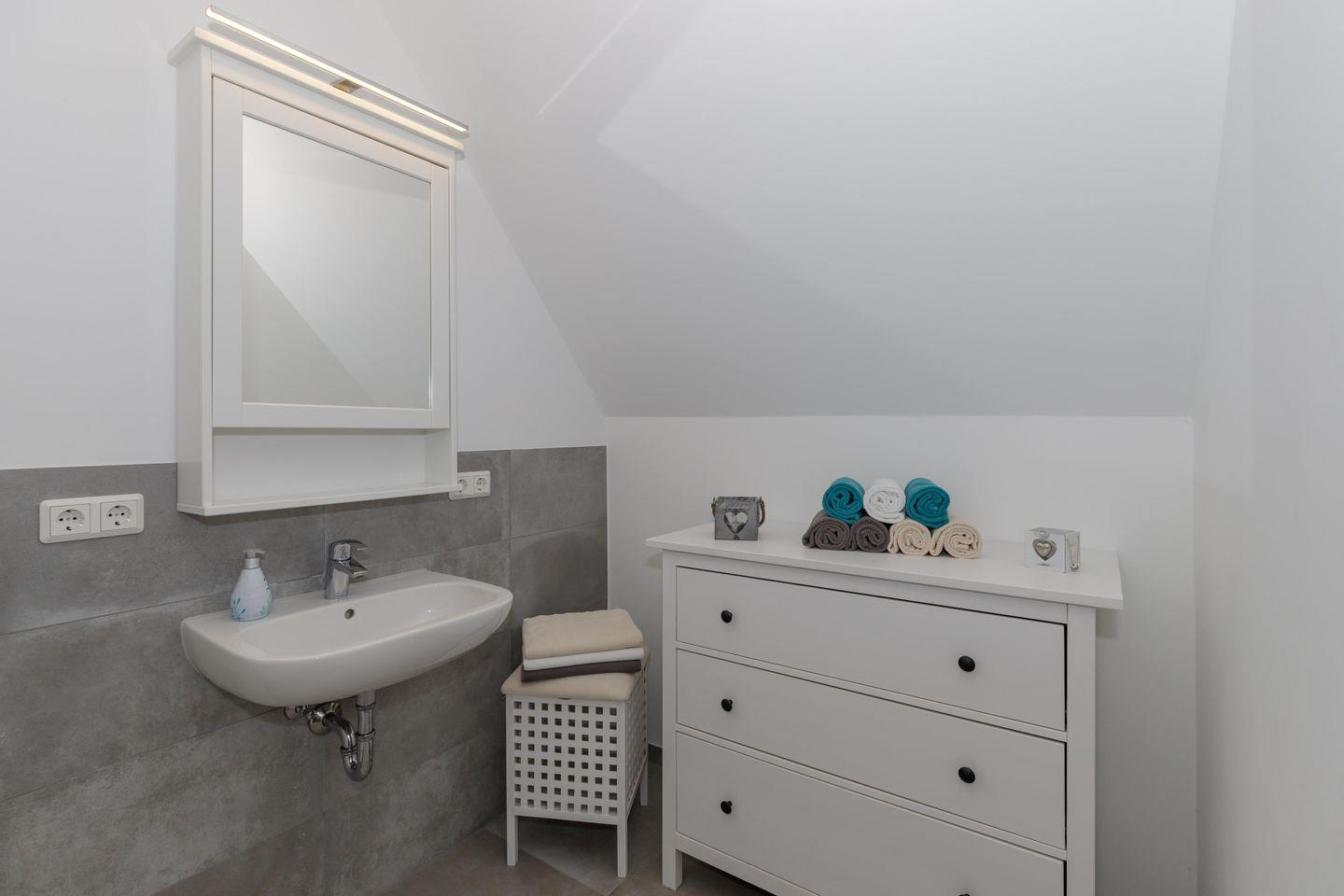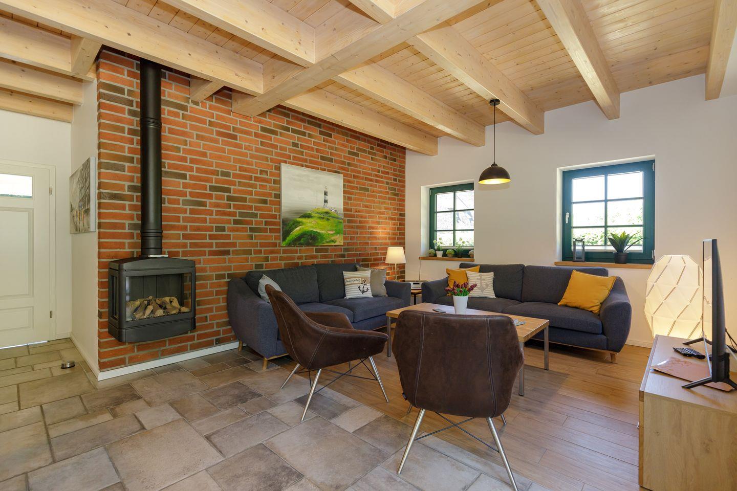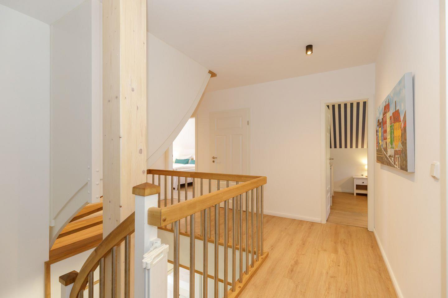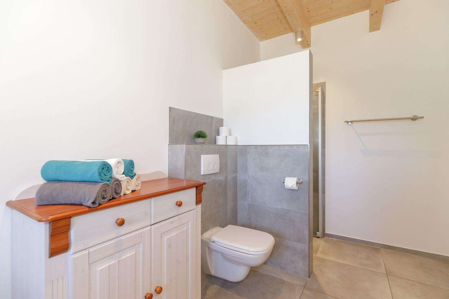 Im Inneren erwarten Sie fünf individuell gestaltete Schlafzimmer. Drei komfortable Badezimmer mit bodengleichen Duschen und eins mit einer Badewanne, bieten genügend Privatsphäre für alle Gäste. Ein separates Gäste-WC im Erdgeschoss sorgt für zusätzlichen Komfort. Die Fußbodenheizung im gesamten Haus sowie Fliesenböden im Wohnzimmer schaffen ein angenehmes Raumklima zu jeder Jahreszeit.