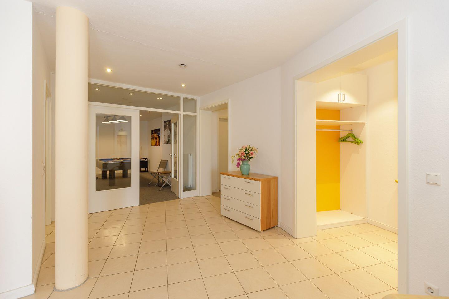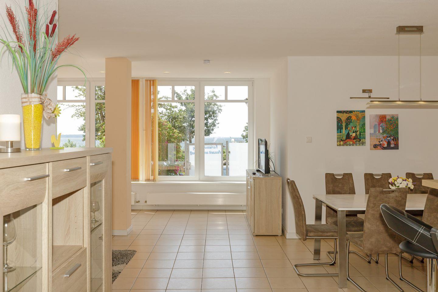 Der großzügige Wohn-Essbereich mit Panoramafenster zum Salzhaff hin bildet den Mittelpunkt der Wohnung. Von hier aus gelangen Sie in die 3 Schlafzimmer mit teilweise direkt angrenzenden Duschbädern, den Billardraum und die Sauna.
