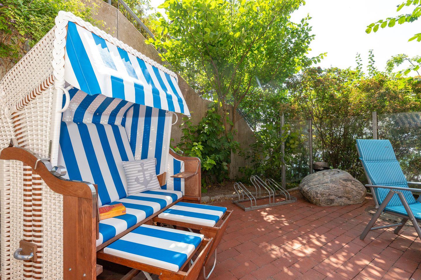 Vor der Wohnung befindet sich die Terrasse mit Sonnenschirm und Glaseinfriedung als Windschutz.