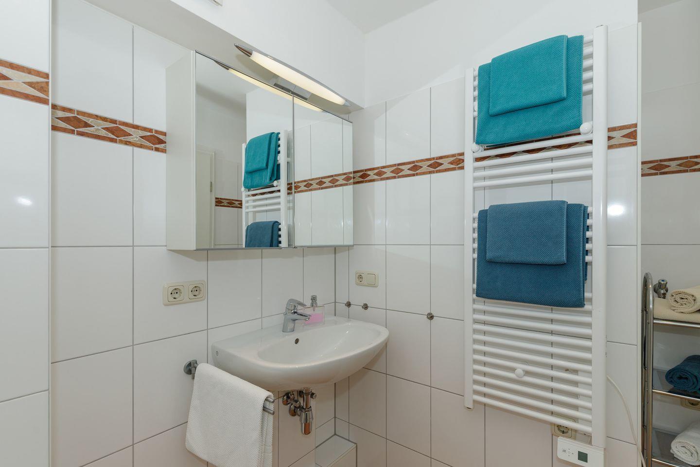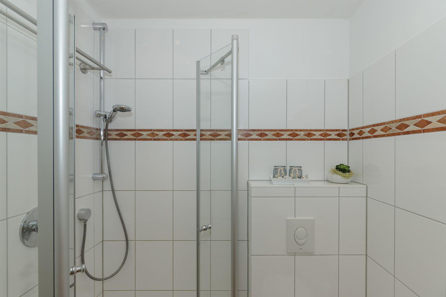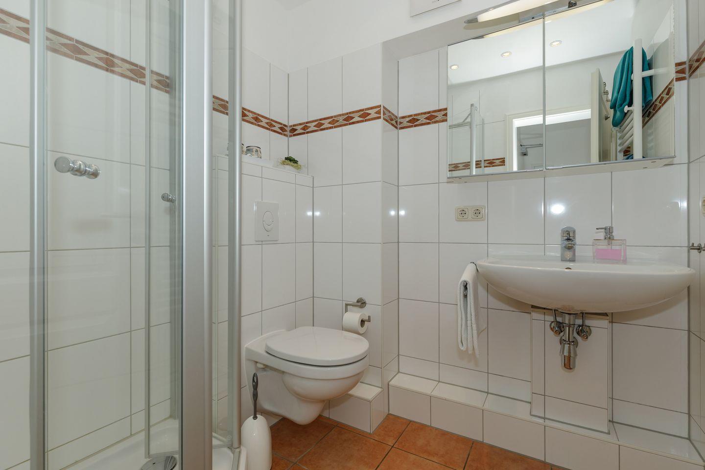 Es gibt zwei Schlafzimmer mit Doppelbett (160x200), sowie ein Bad mit Dusche und WC und ein Gäste-WC.