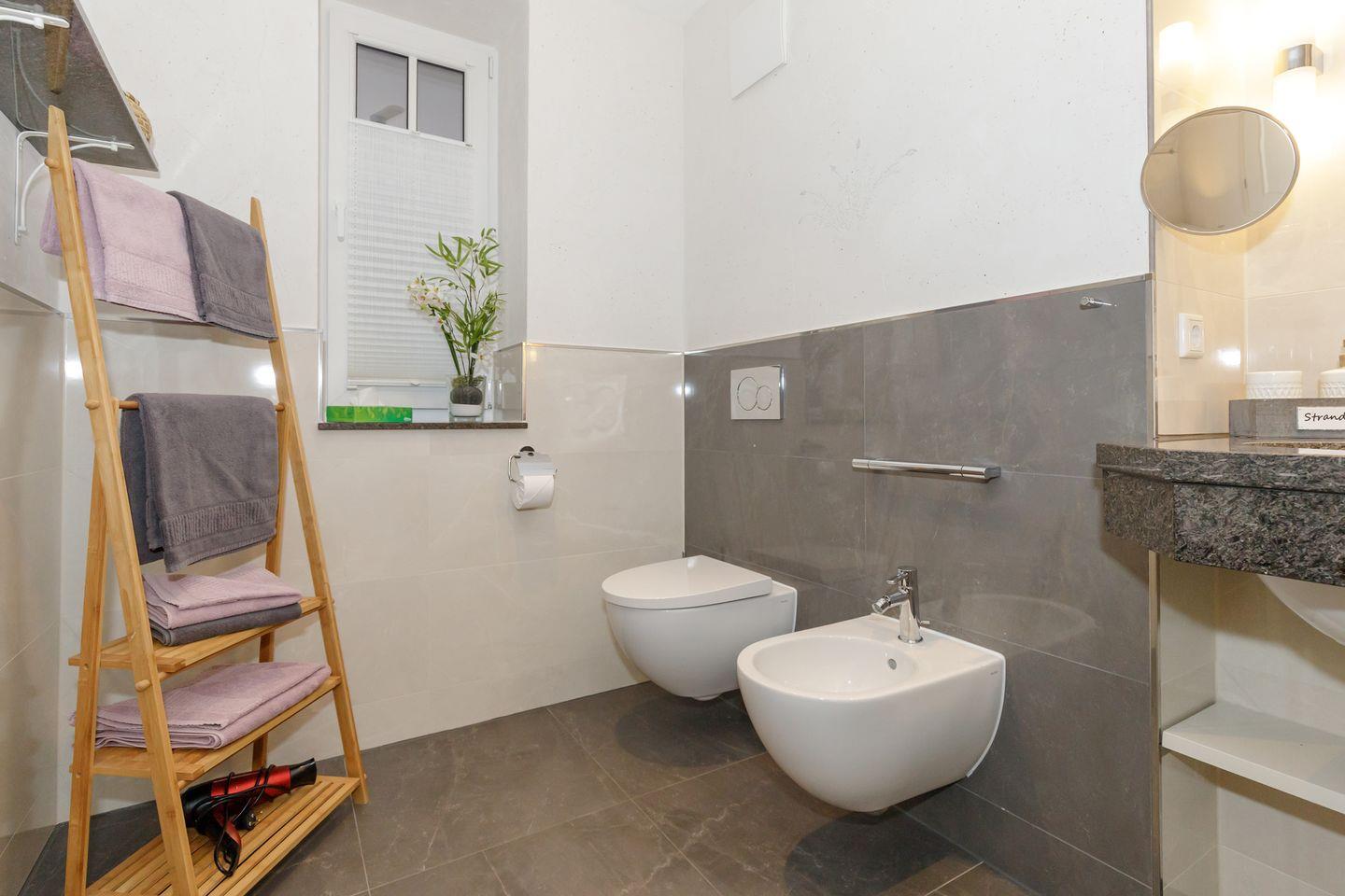 Das sehr geräumige Bad mit bodengleicher Dusche und großer Regenbrause, Doppel-Waschbecken, Toilette und Bidet, sowie Infrarot-Wärmekabine verfügt über ein Tageslichtfenster.