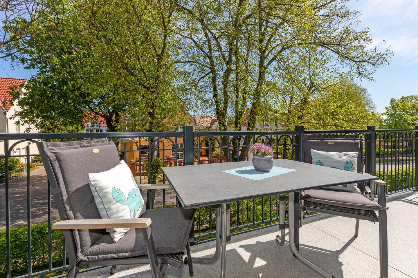 Vom hellen lichtdurchfluteten Wohnbereich mit gemütlicher Leder-Sitzecke, Relaxsessel und Massivholzmöbeln gelangen Sie auf den Süd/West-Balkon mit einem gemütlichen Strandkorb und einem Lounchsofa für einen entspannten Tagesausklang.