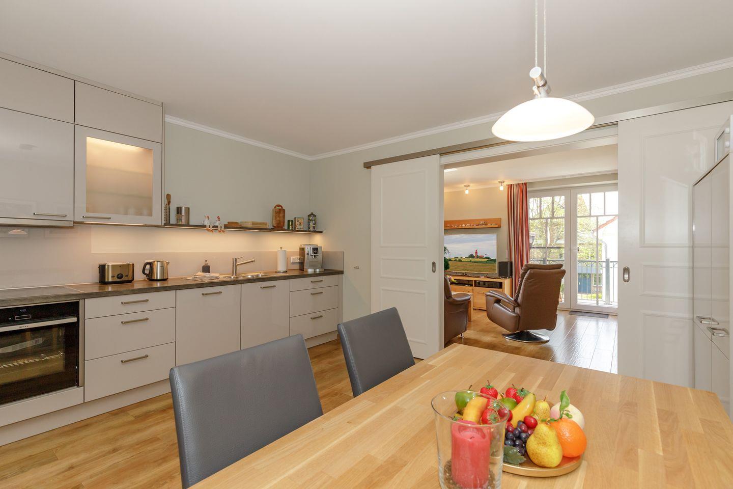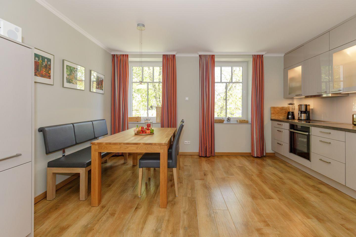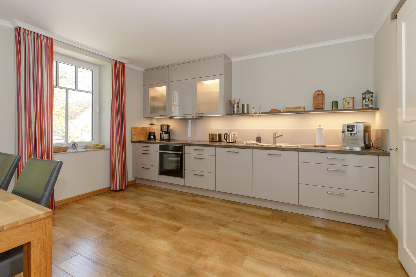 Die hochwertige Küche mit großem Esstisch ist mit allem technischen Komfort ausgestattet.
