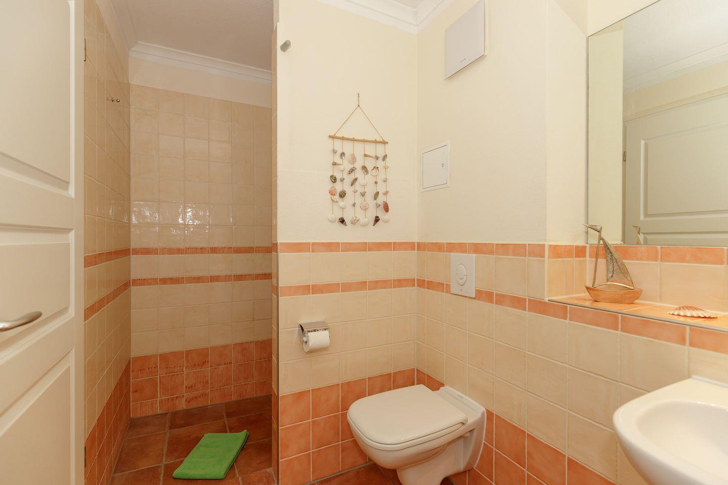 Das sehr schicke Bad hat eine geräumige bodengleiche Dusche. Die Wohnung hat einen pflegeleichten Laminatboden.