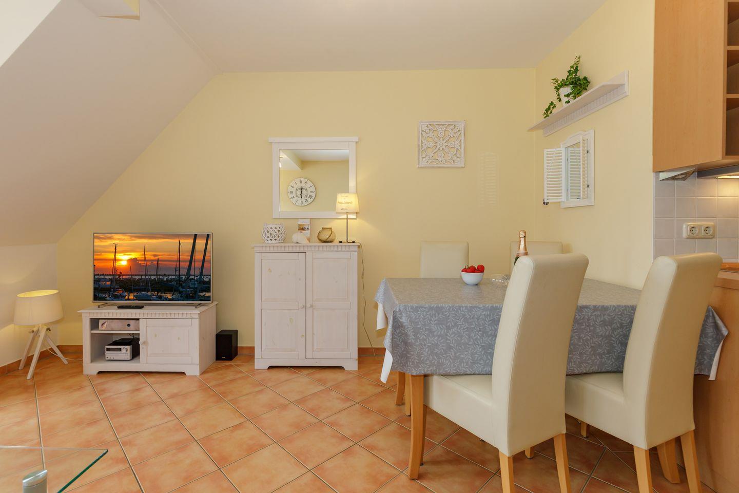 Die hochwertig und geschmackvoll eingerichtete 2-Zimmerwohnung (46 qm) liegt im 1. OG der Villa Rosita II. Ideal für Gäste, die Wert auf Wohnqualität legen und die Nähe zum Meer.