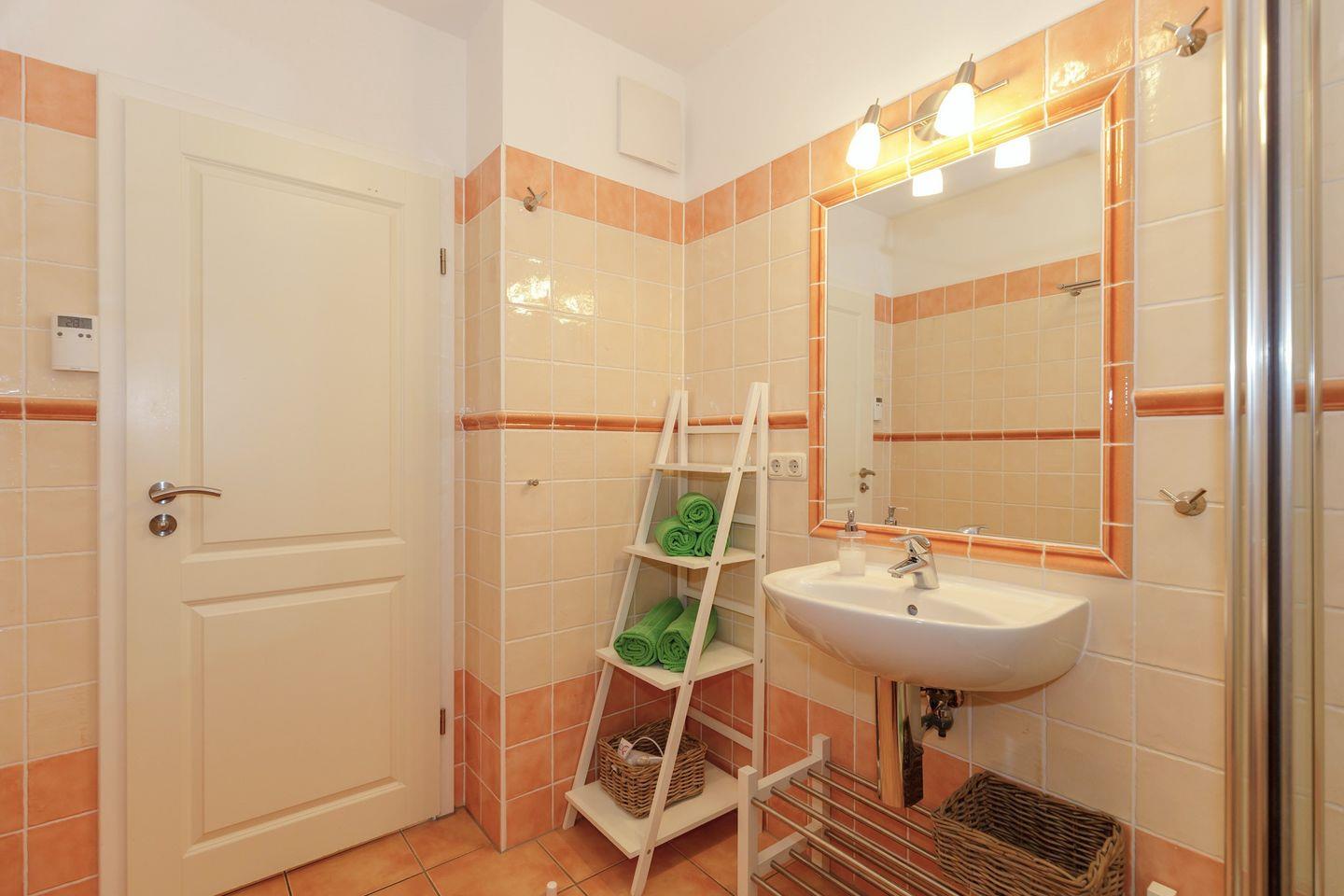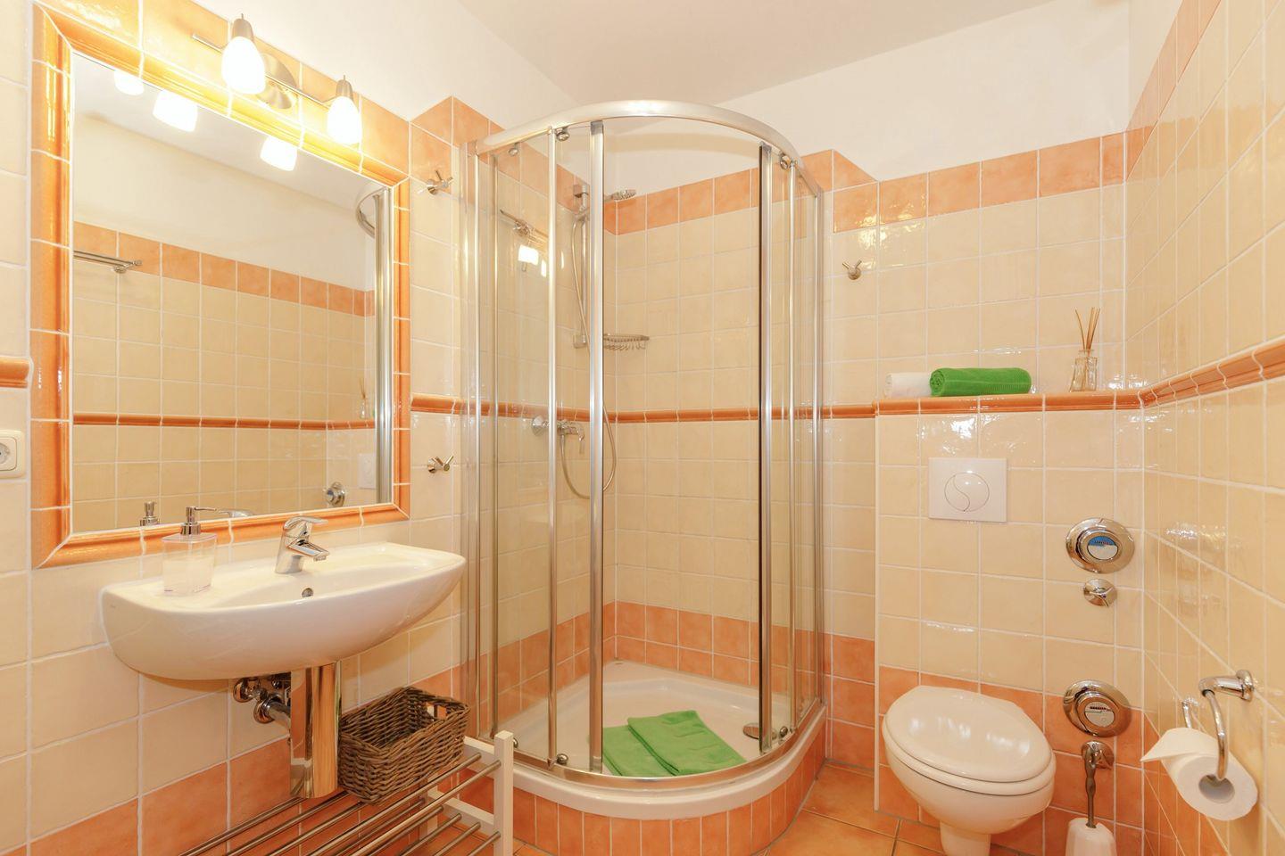 Das sehr schicke Bad hat eine Dusche, ein Föhn ist selbstverständlich vorhanden.