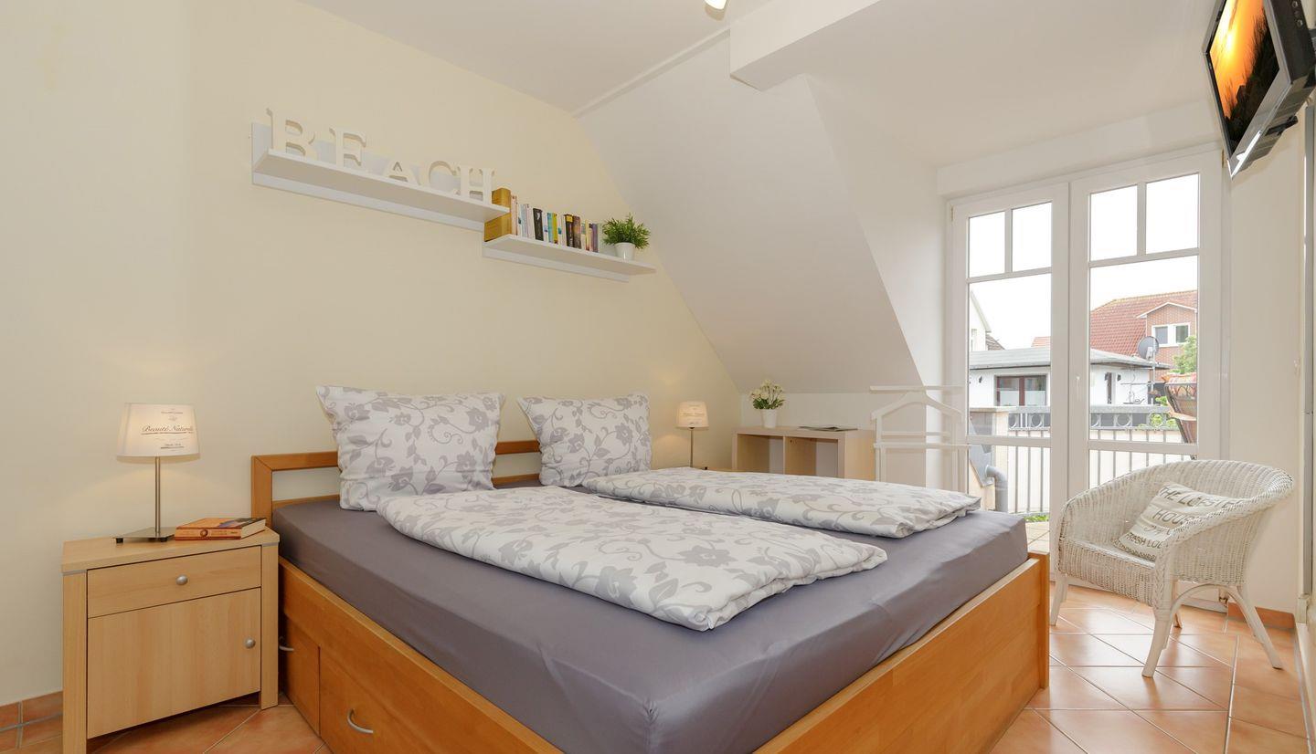 Im großzügigen Schlafzimmer mit Doppelbett gibt es ein zweites TV-Gerät.