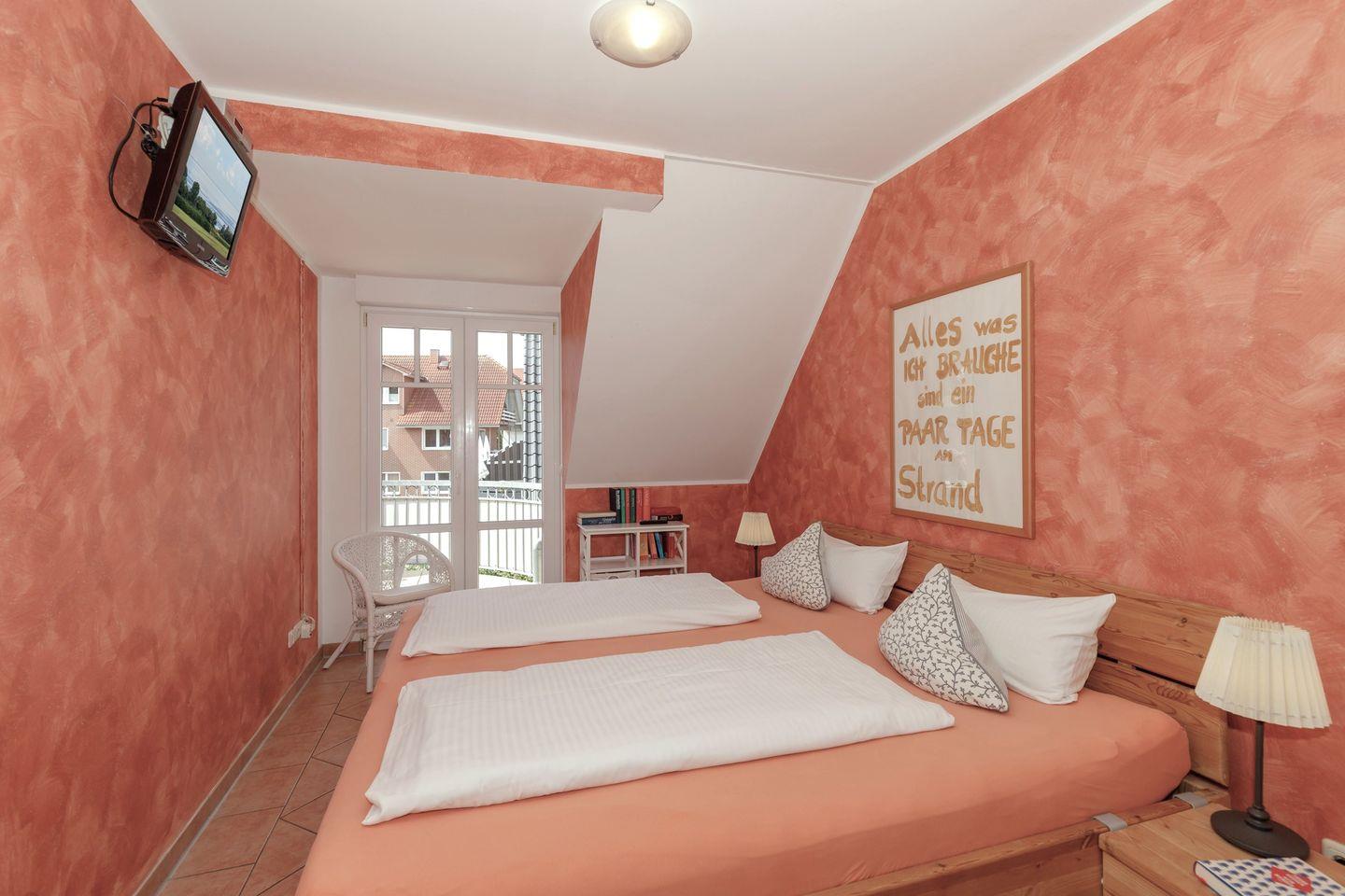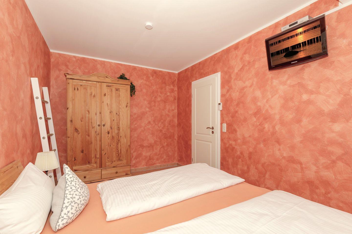 Das Schlafzimmer ist mit einem zweiten TV-Gerät versehen. Platz für das Aufstellen eines Reisekinderbettes ist vorhanden.
