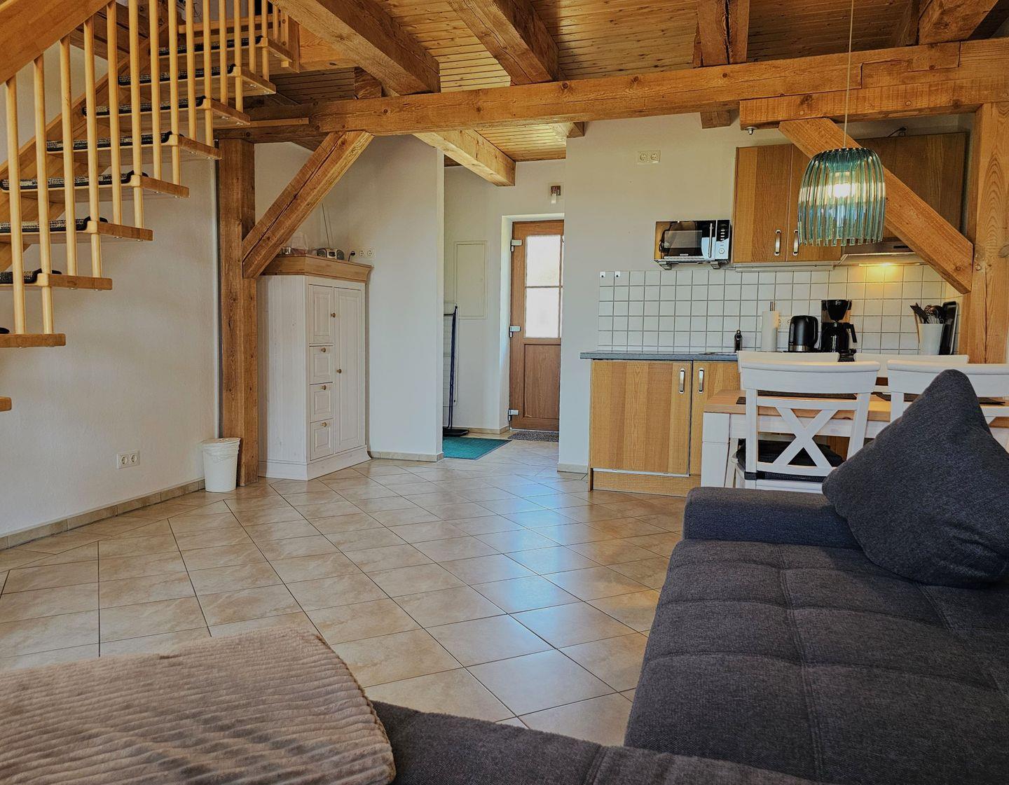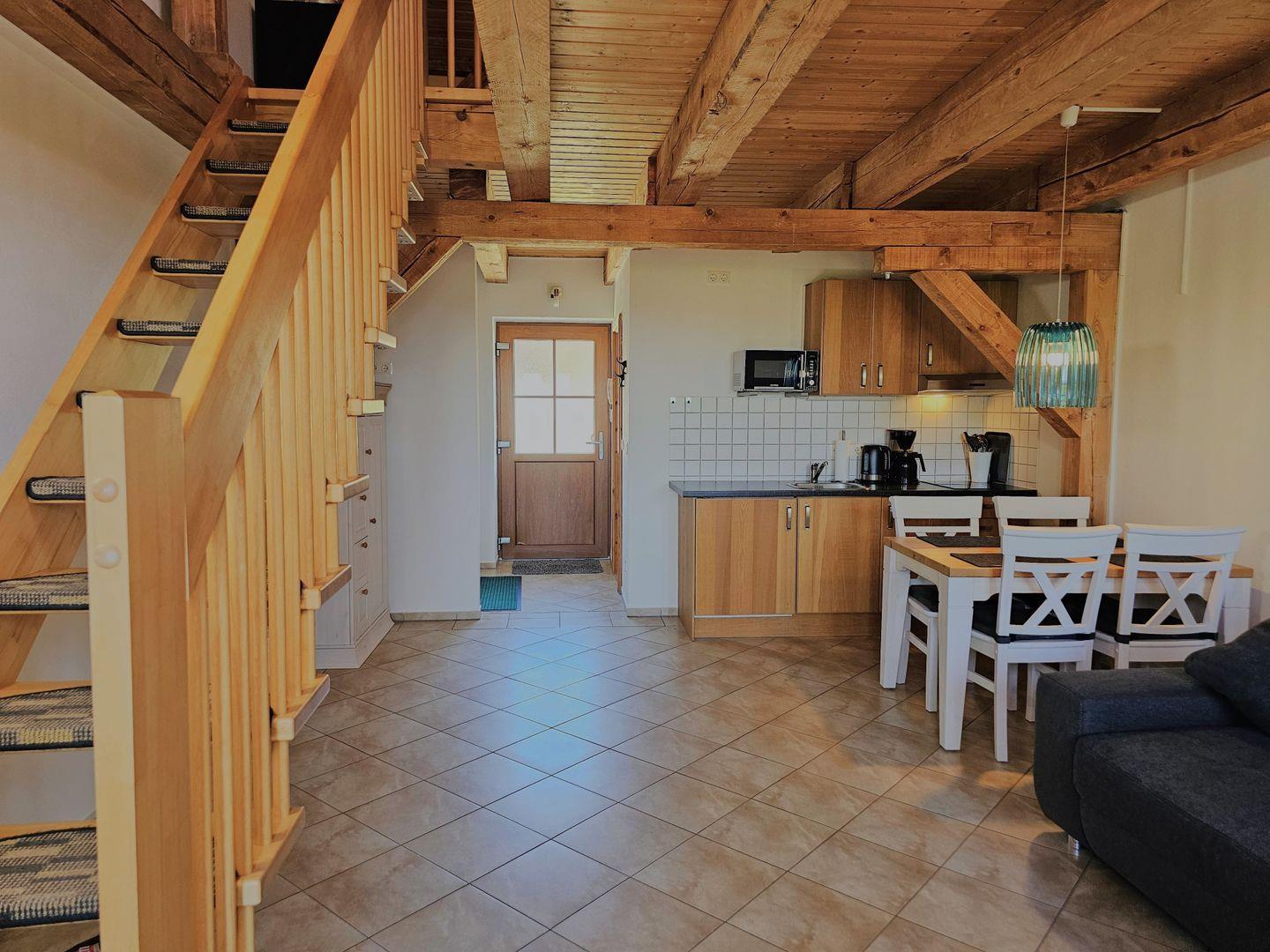 Im Erdgeschoss erwartet Sie der Wohn-Essbereich mit einer Eckcouch und Flachbildfernseher, dazu eine vollausgestattete Küche und ein Bad mit Dusche. Über eine Holztreppe gelangen Sie nach oben in den gemütlichen Schlafbereich mit großem Bett (180x200), Schlafcouch (120x180), Kleiderschrank und Smart-TV.