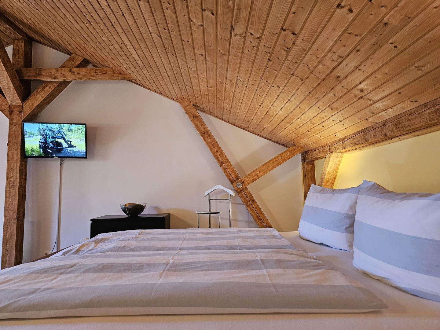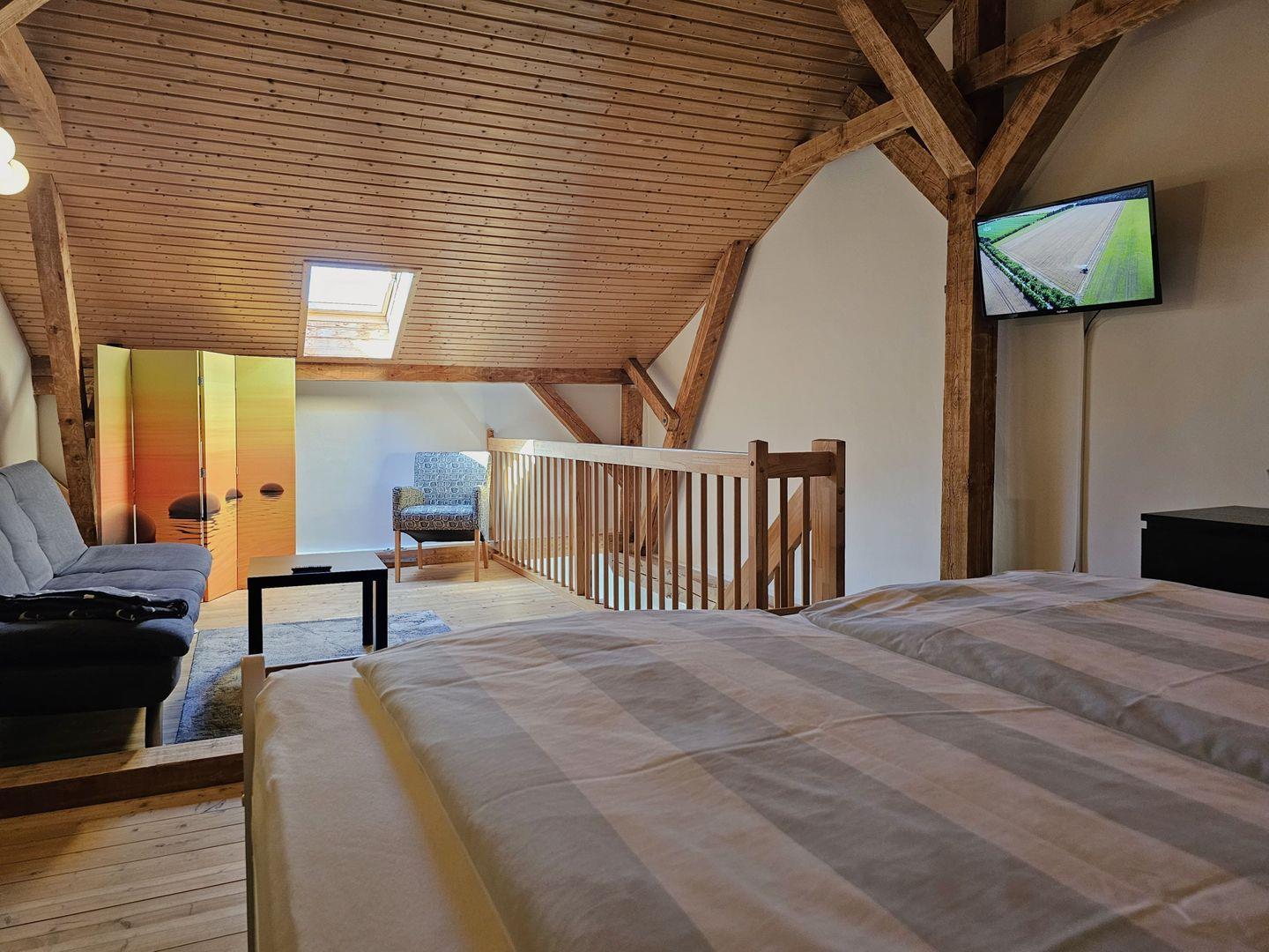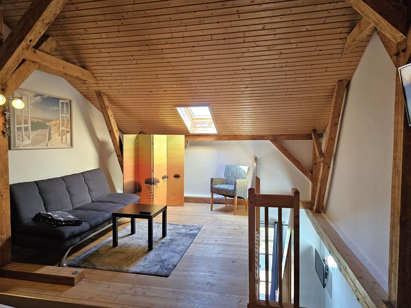 Über eine Holztreppe gelangen Sie nach oben in den gemütlichen Schlafbereich mit großem Bett (180x200), Schlafcouch (120x180), Kleiderschrank, Sideboard und einem 2. Fernseher.