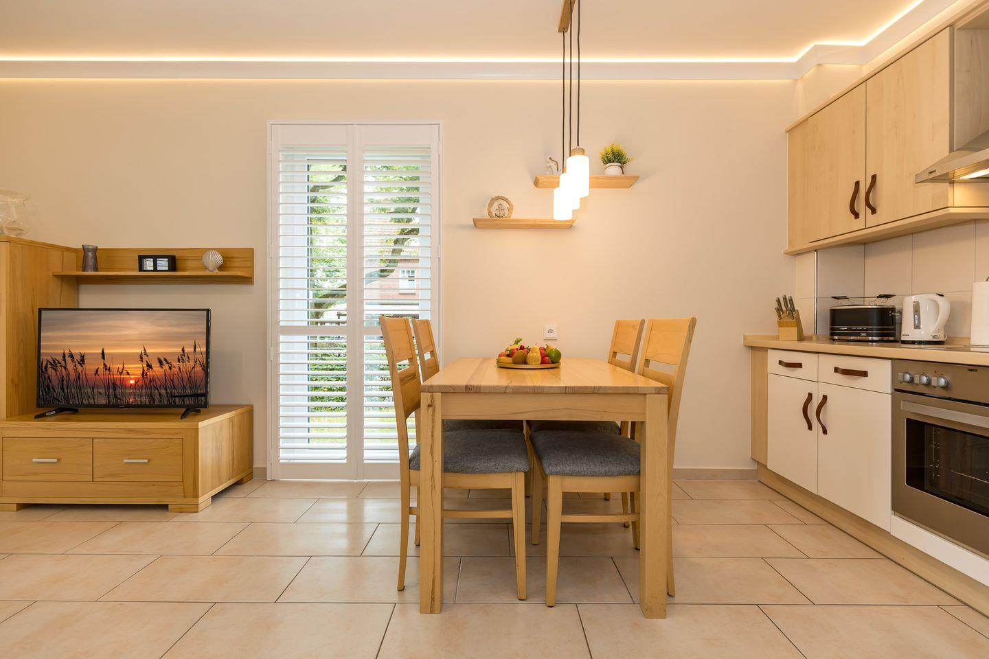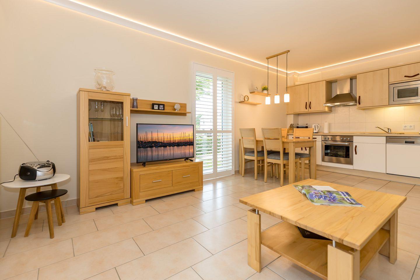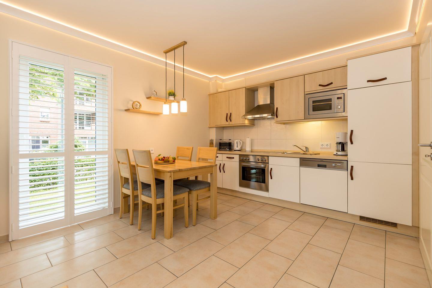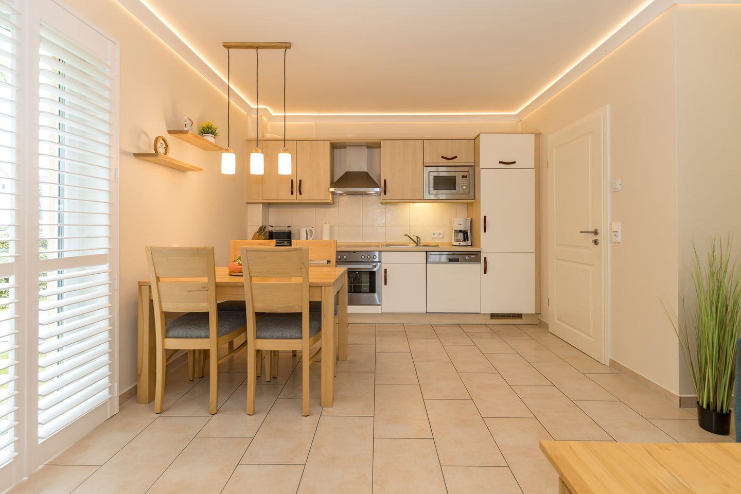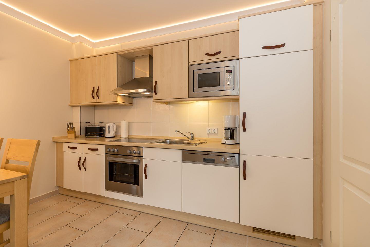 Die offene Küche beinhaltet eine voll ausgestattete Einbauküchenzeile mit 4-Platten-Ceran-Kochfeld, Backofen, Dunstabzug, Mikrowelle, Kühlschrank mit Gefrierfach, Geschirrspülmaschine, Kaffeemaschine, Wasserkocher und Toaster. Die Küche ist mit Geschirr, Gläsern, Besteck und Töpfen bestens und ausreichend ausgestattet.