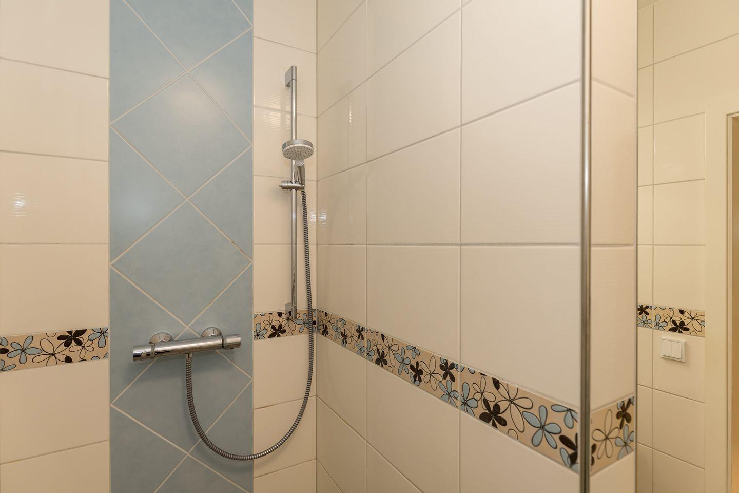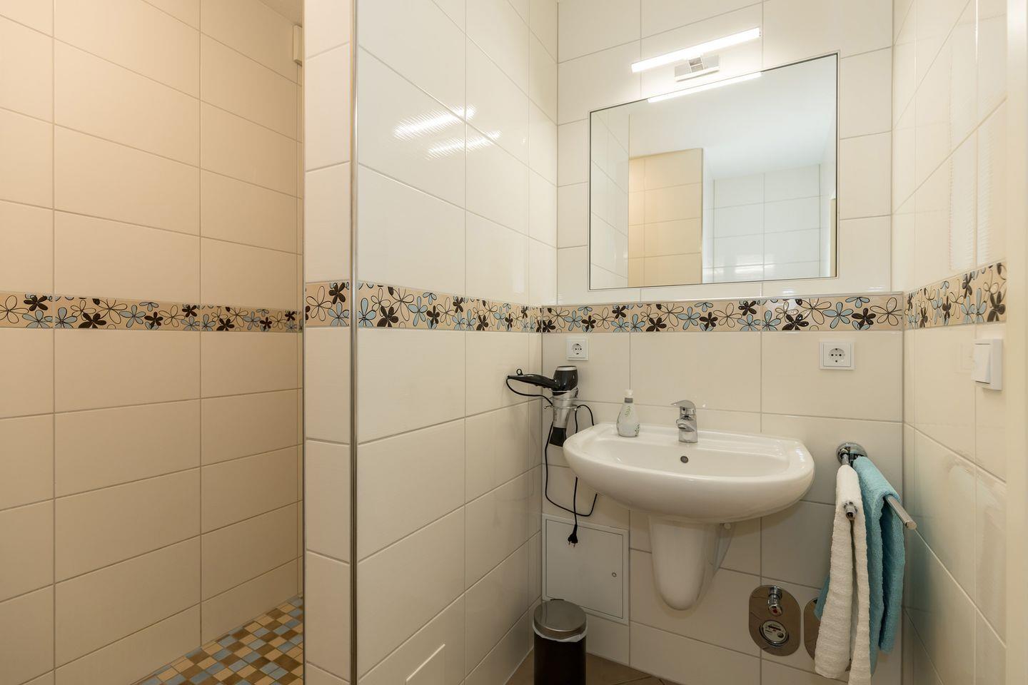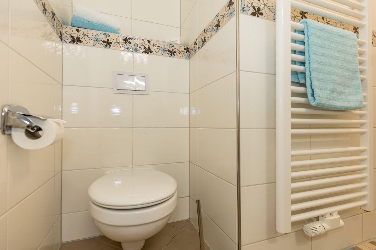 Das Badezimmer verfügt über eine Dusche mit ebenerdigem Einstieg (seniorenfreundlich!) und thermostatgeregelter Duschbrause, Waschbecken, WC, Föhn, Handtuch-Heizkörper und Fußbodenheizung.