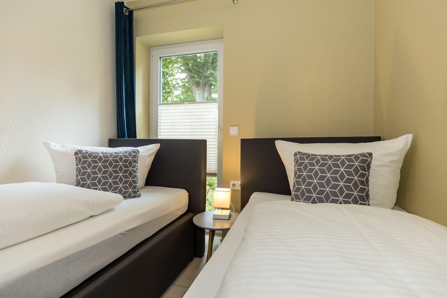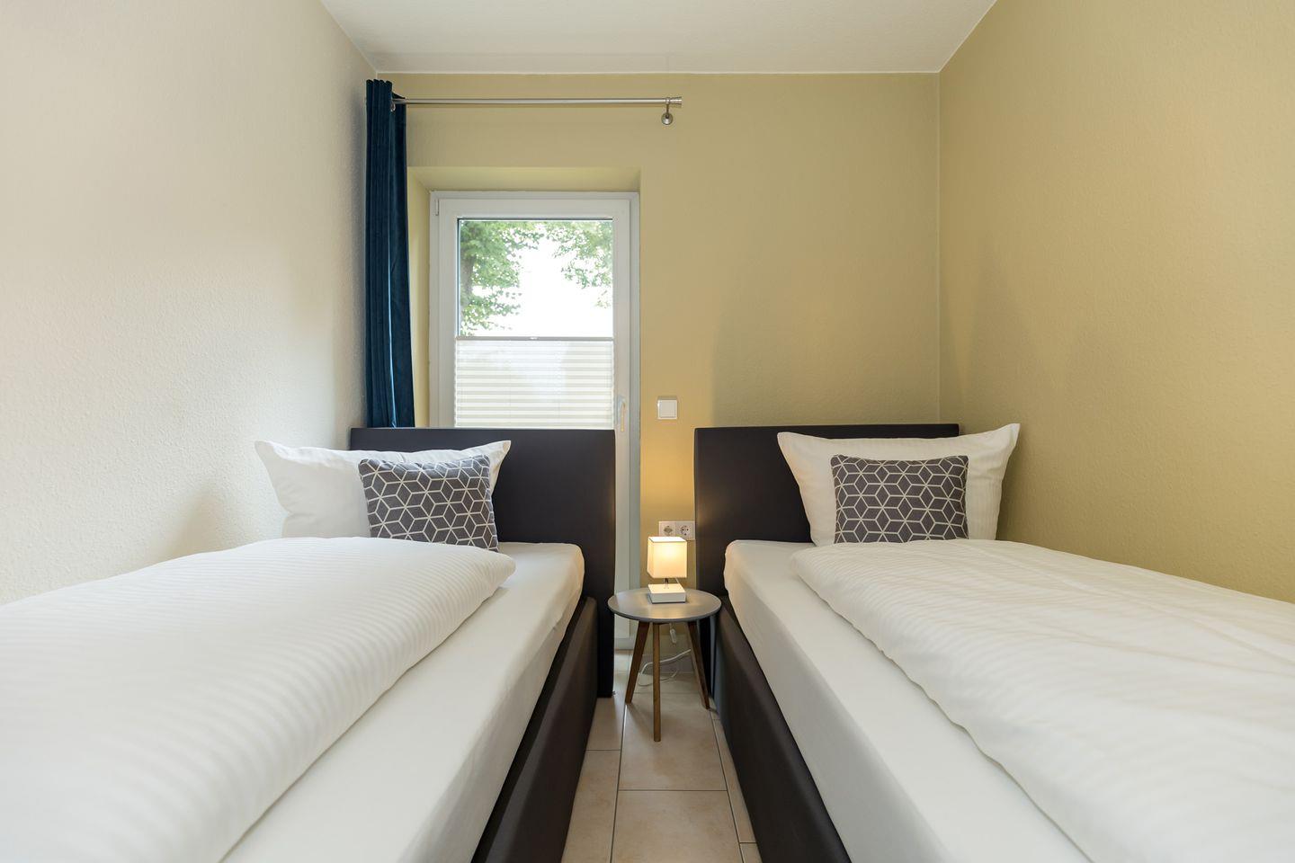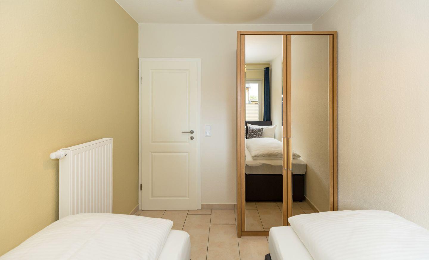 Das freundliche Schlafzimmer ist mit 2 getrennten Boxspring-Einzelbetten, Nachttisch sowie einem geräumigen Kleiderschrank eingerichtet. Eine zusätzliche bequeme Schlafmöglichkeit für eine weitere 3. Person bietet die ausziehbare Schlafcouch im Wohnzimmer. Bettwäsche und Handtücher können hinzugebucht werden.