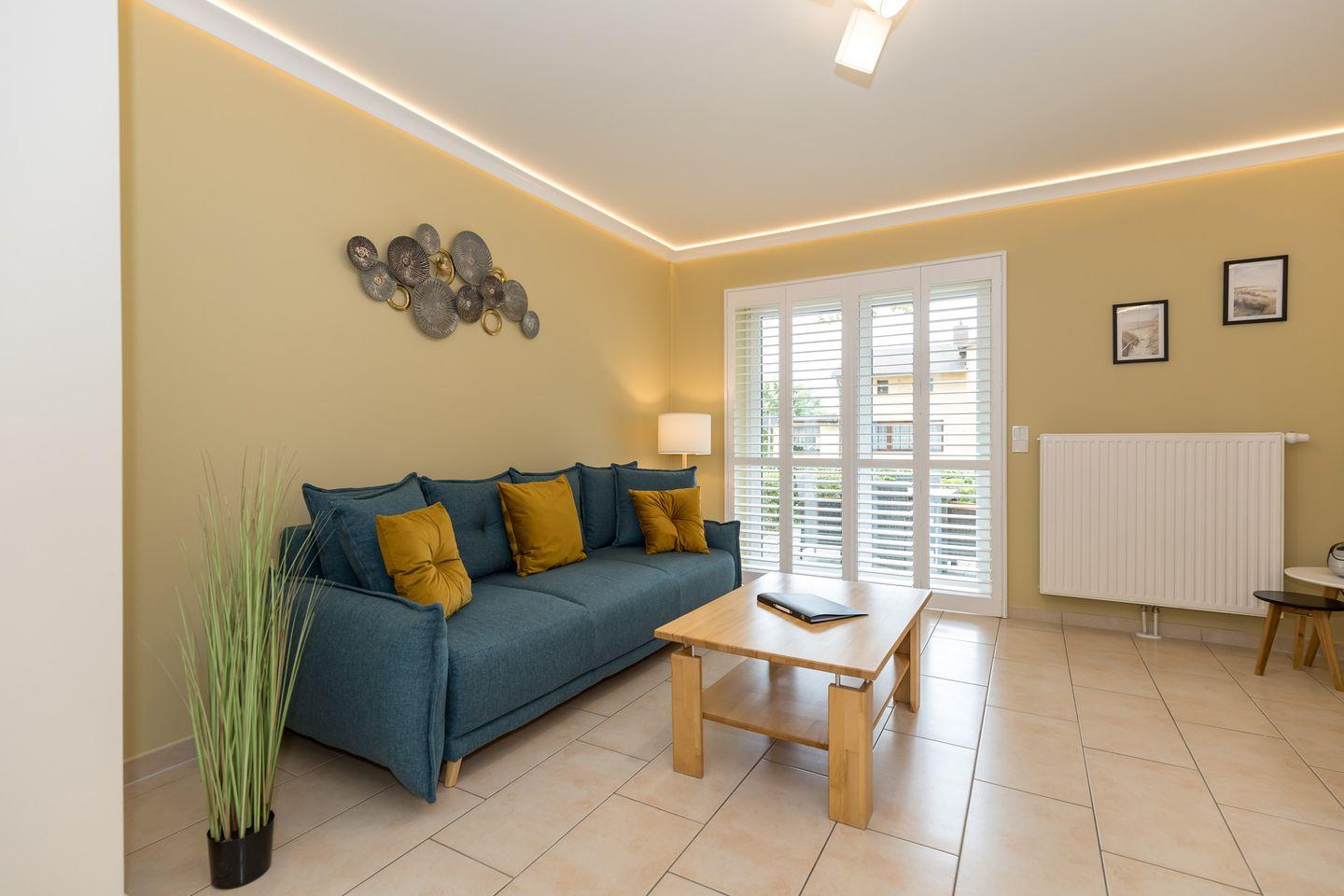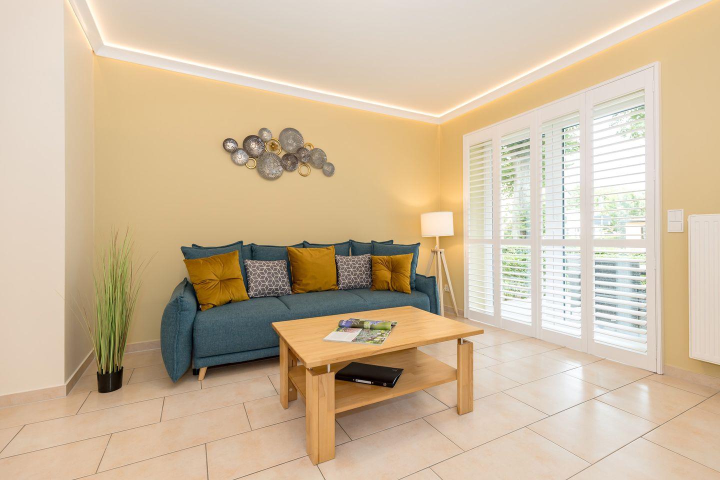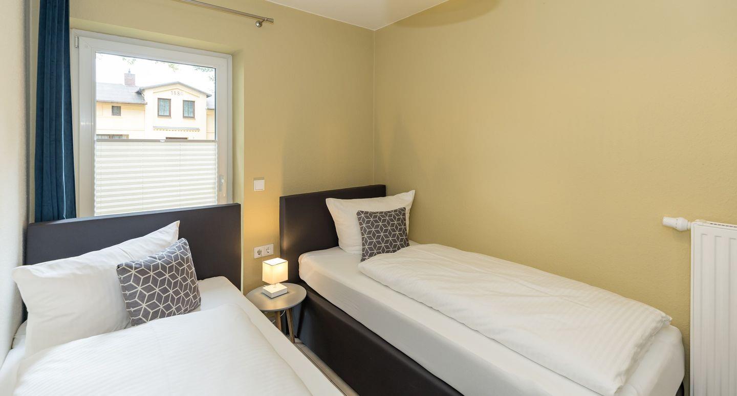 Das freundliche Schlafzimmer ist mit 2 getrennten Boxspring-Einzelbetten, Nachttisch sowie einem geräumigen Kleiderschrank eingerichtet. Eine zusätzliche bequeme Schlafmöglichkeit für eine weitere 3. Person bietet die ausziehbare Schlafcouch im Wohnzimmer. Bettwäsche und Handtücher können hinzugebucht werden.