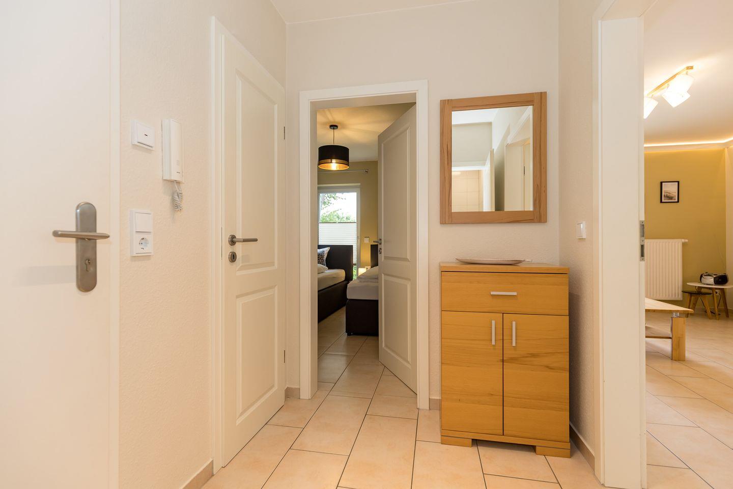 Vom Flur mit Garderobe, Spiegel und Kommode erreichen Sie bequem alle Räume Ihrer Ferienwohnung.