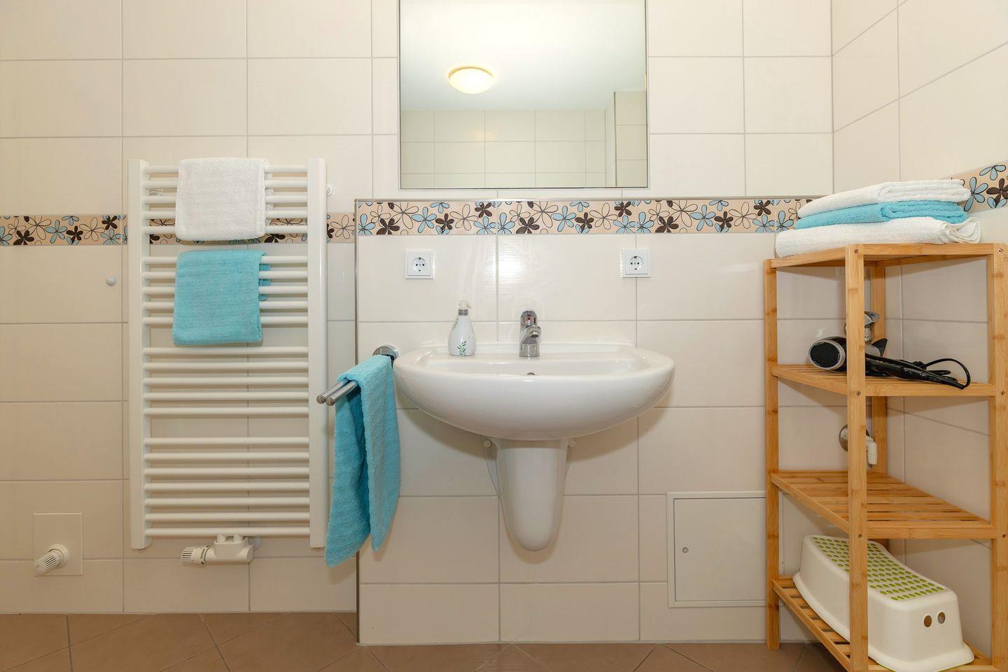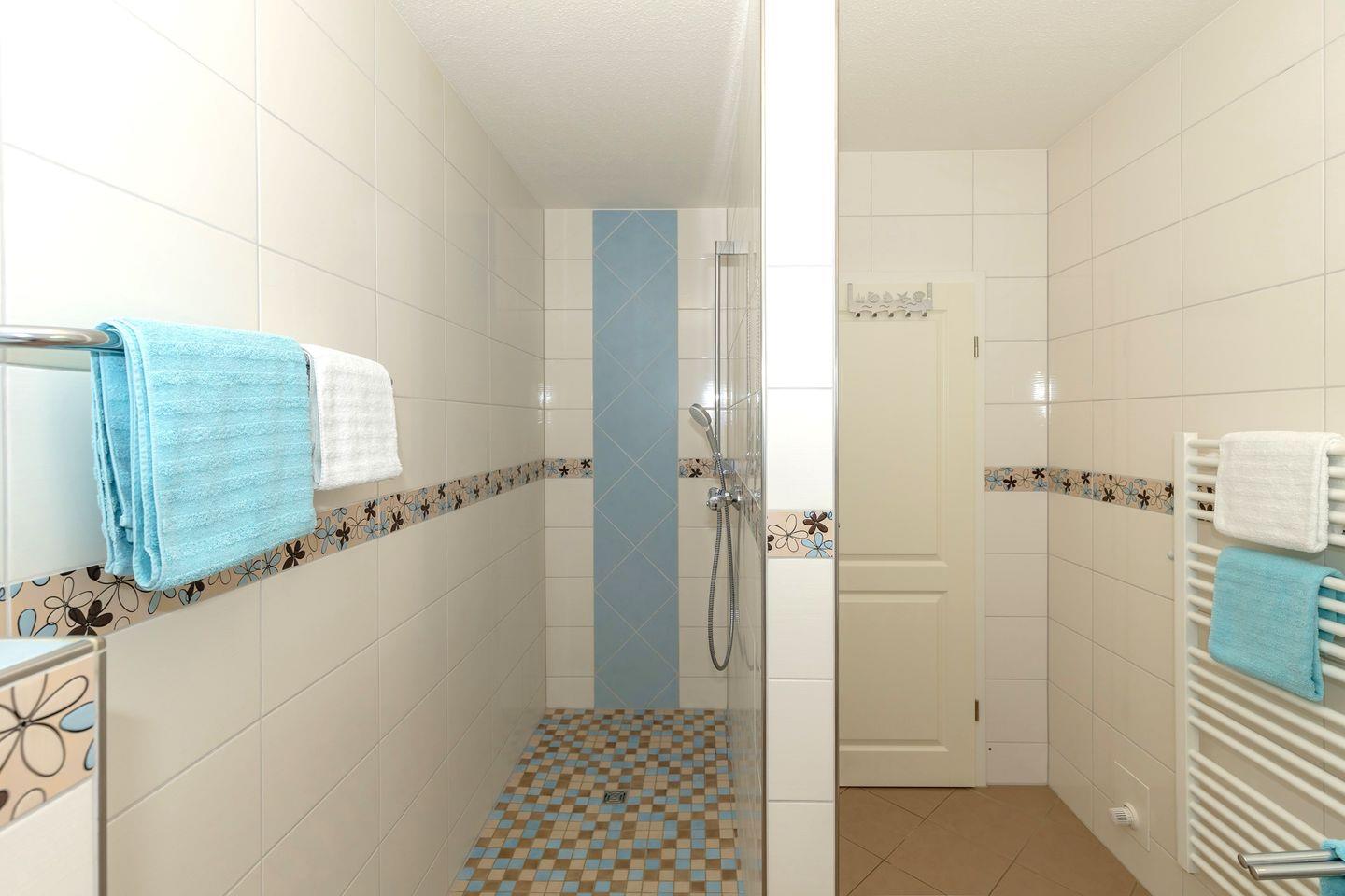 Das große und moderne Badezimmer (mit Tageslicht / Fenster) verfügt über einen sehr großen Duschbereich (180 cm x 90 cm) mit ebenerdigem Einstieg (seniorenfreundlich!) und thermostatgeregelter Duschbrause, Waschbecken, WC, Föhn, Handtuch-Heizkörper, Fußbodenheizung sowie ausreichend Ablagemöglichkeiten.