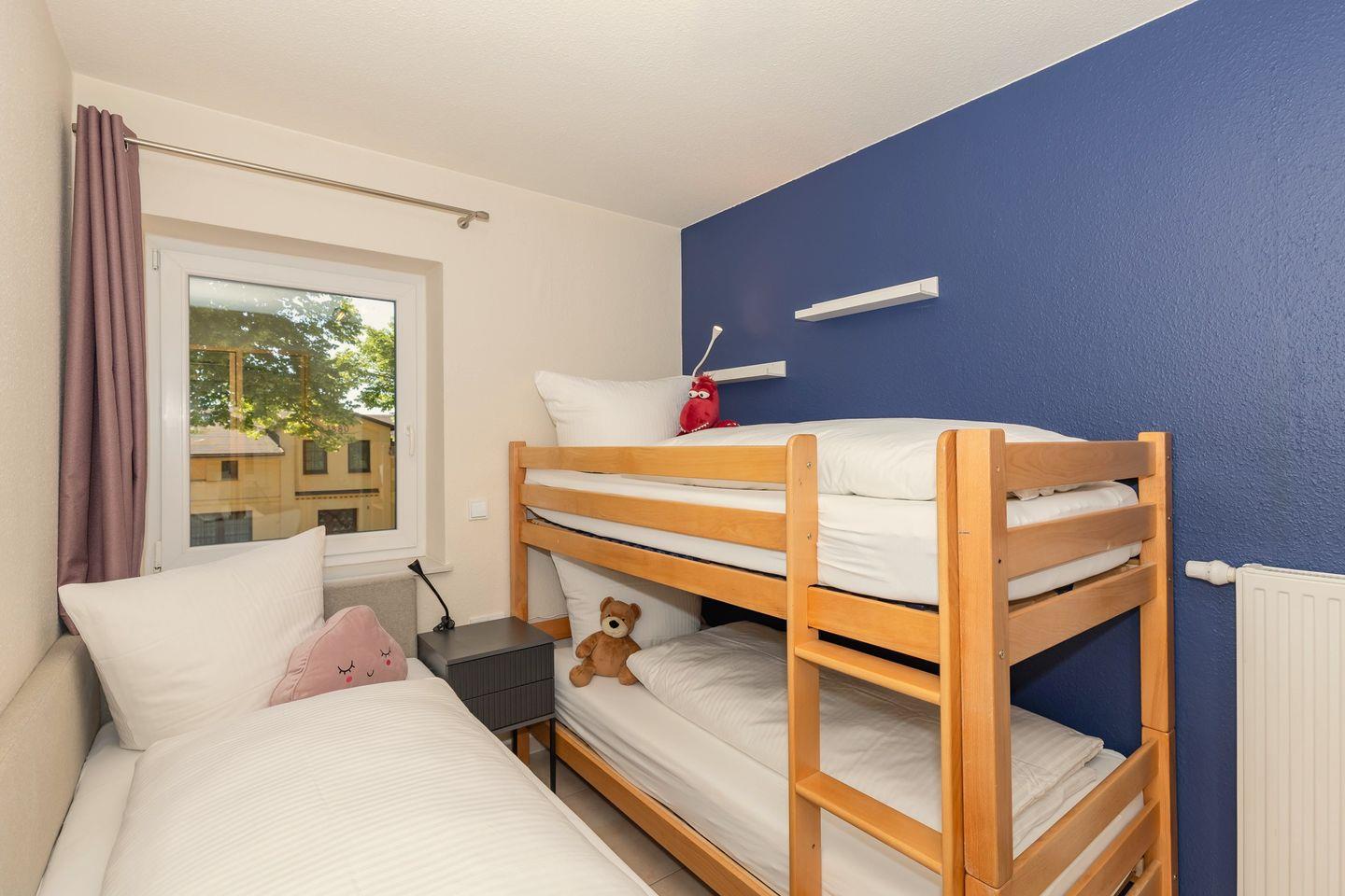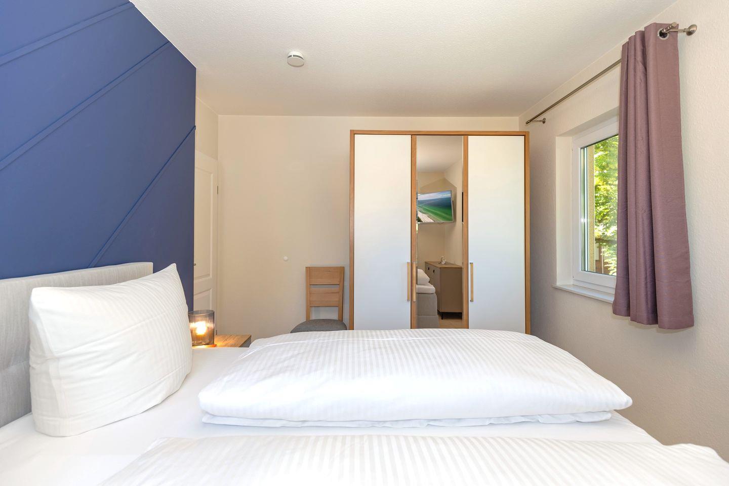 Das freundliche 1. Schlafzimmer ist mit einem bequemen Doppelbett, Nachttischen sowie einem geräumigen Kleiderschrank eingerichtet. Das separate 2. Schlafzimmer verfügt über ein separates Boxspring-Einzelbett, ein Etagen-/Doppelstockbett (für Kinder), einen Nachttisch sowie einen geräumigen Kleiderschrank. Bettwäsche und Handtücher können hinzugebucht werden.