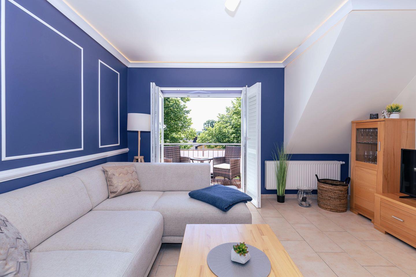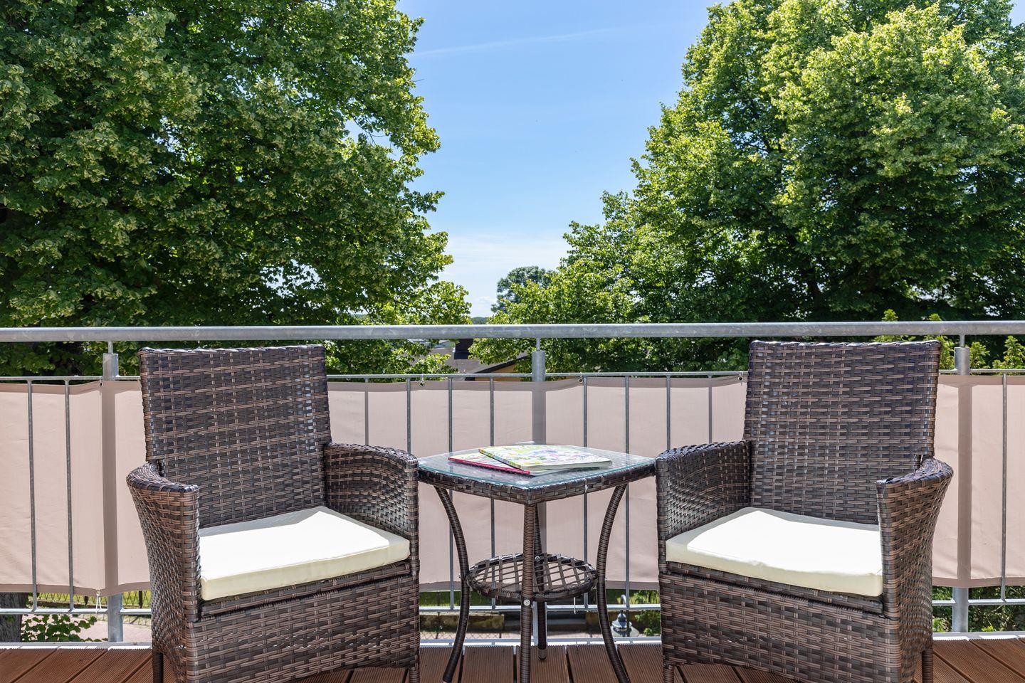 Das geräumige Wohn-/Esszimmer verfügt über eine separate Sitzgruppe mit großer, bequemer Couch und Couchtisch, eine Schrankwohnwand sowie einen separaten Esstisch mit 4 Stühlen. Vom Wohnzimmer aus haben Sie direkten Zugang zu dem großen und sonnigen Balkon (nach Süden ausgerichtet) mit Balkonmöbeln für 3 Personen - hier sitzen Sie entspannt und gemütlich im Grünen!