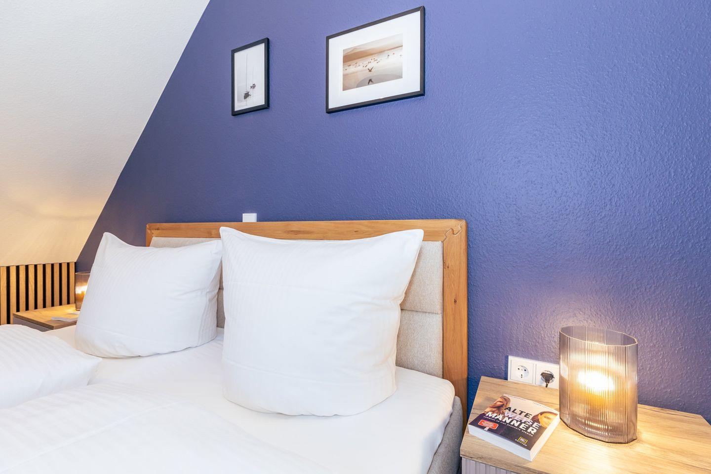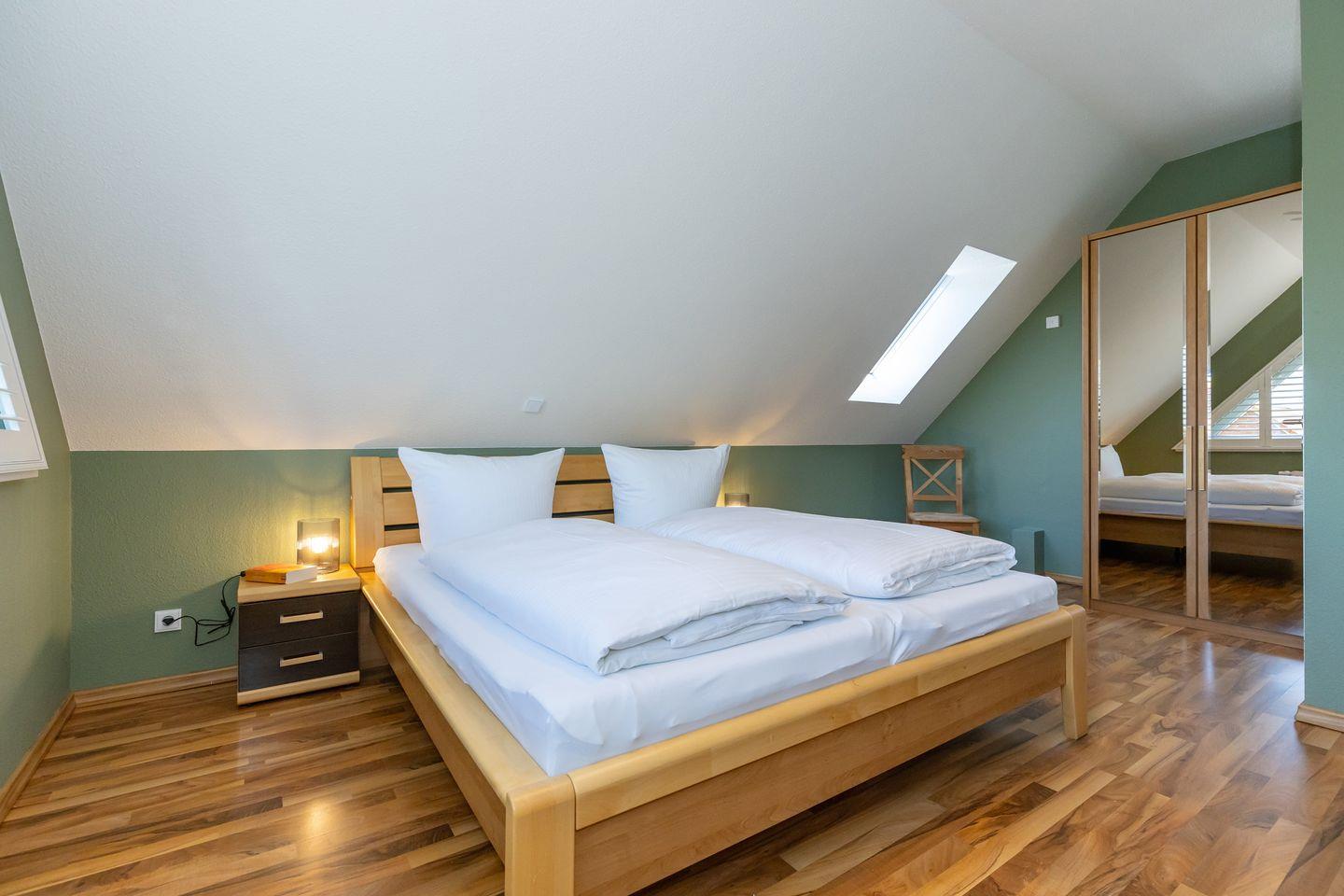Das freundliche 1. Schlafzimmer ist mit einem bequemen Boxspringbett (180x200), Nachttischen, sowie einem geräumigen Kleiderschrank eingerichtet. Das separate 2. Schlafzimmer verfügt über ein Boxspring-Einzelbett, einen Nachttisch sowie einen Kleiderschrank. Das separate 3. Schlafzimmer in der 2. Etage ist mit einem bequemen Doppelbett, Nachttischen, einem Kleiderschrank sowie einm breiten Schlafsessel für 1 Person eingerichtet. Bettwäsche und Handtücher können hinzugebucht werden.
