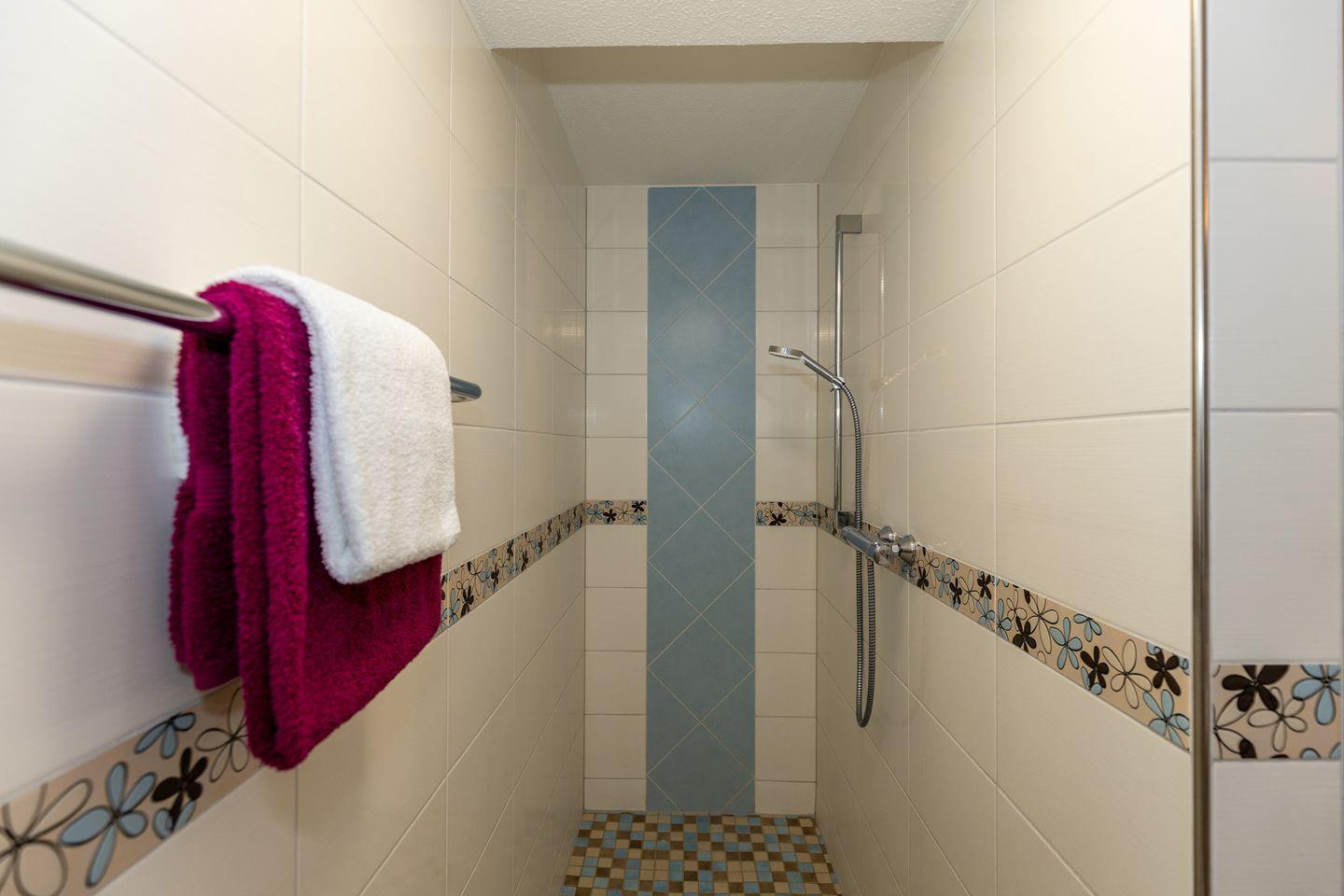 Das große und moderne Badezimmer (mit Tageslicht / Fenster) verfügt über einen sehr großen Duschbereich (180 cm x 90 cm) mit ebenerdigem Einstieg (seniorenfreundlich!) und thermostatgeregelter Duschbrause, Waschbecken, WC, Föhn, Handtuch-Heizkörper, Fußbodenheizung sowie ausreichend Ablagemöglichkeiten.