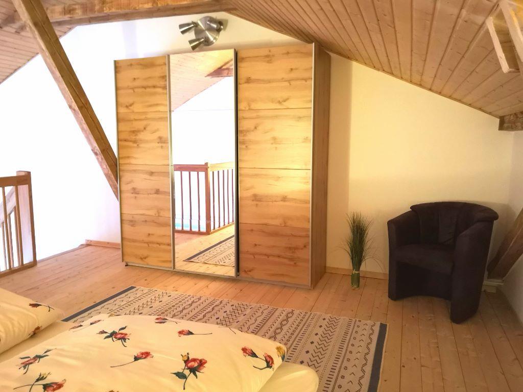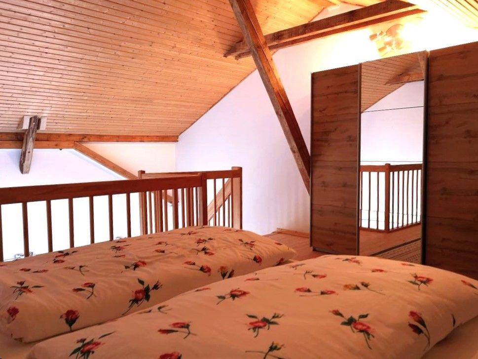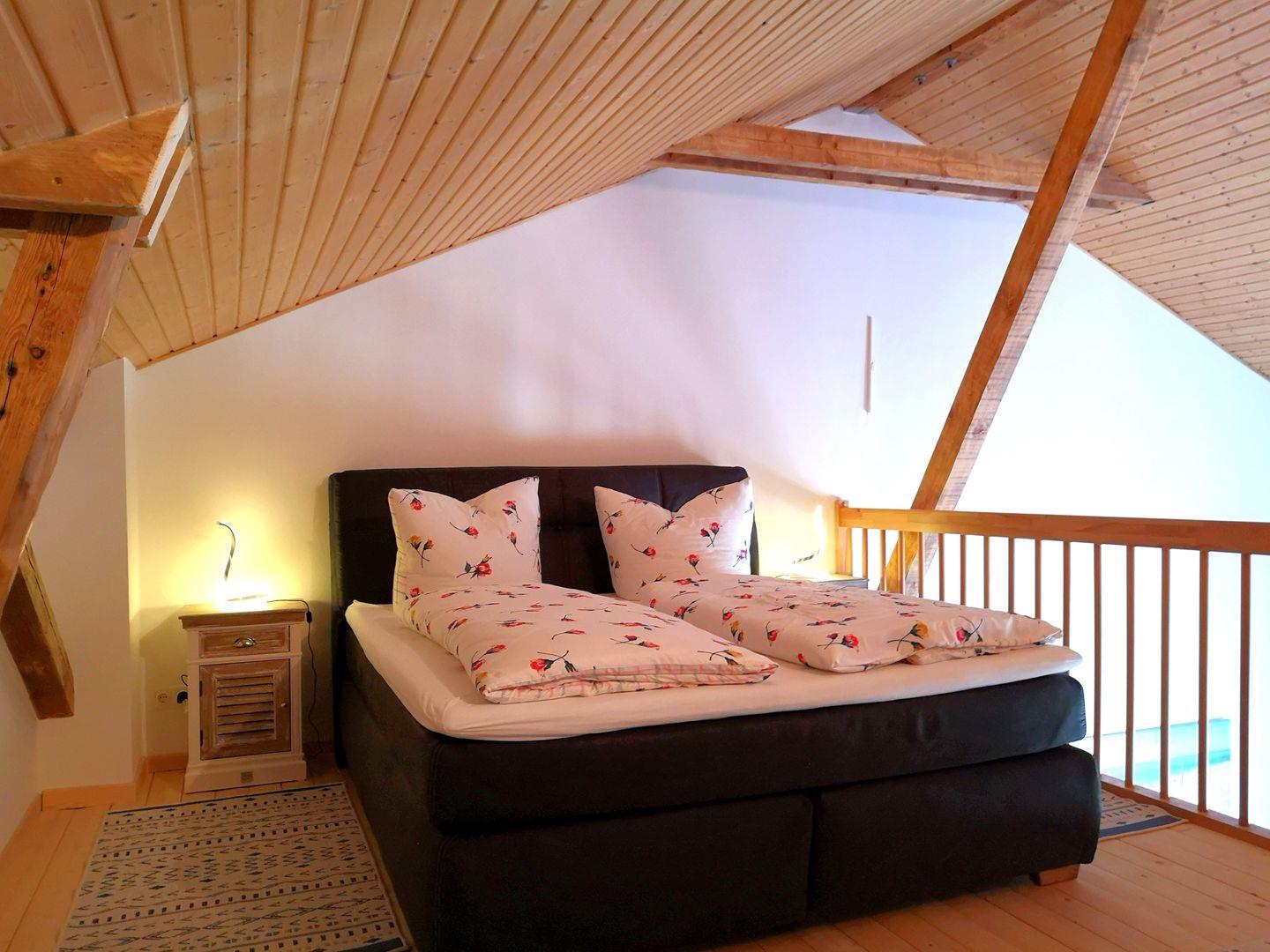 Über eine Holztreppe gelangen Sie nach oben in den gemütlichen Schlafbereich mit einem großem Boxspringbett (180x200) und einem Kleiderschrank.