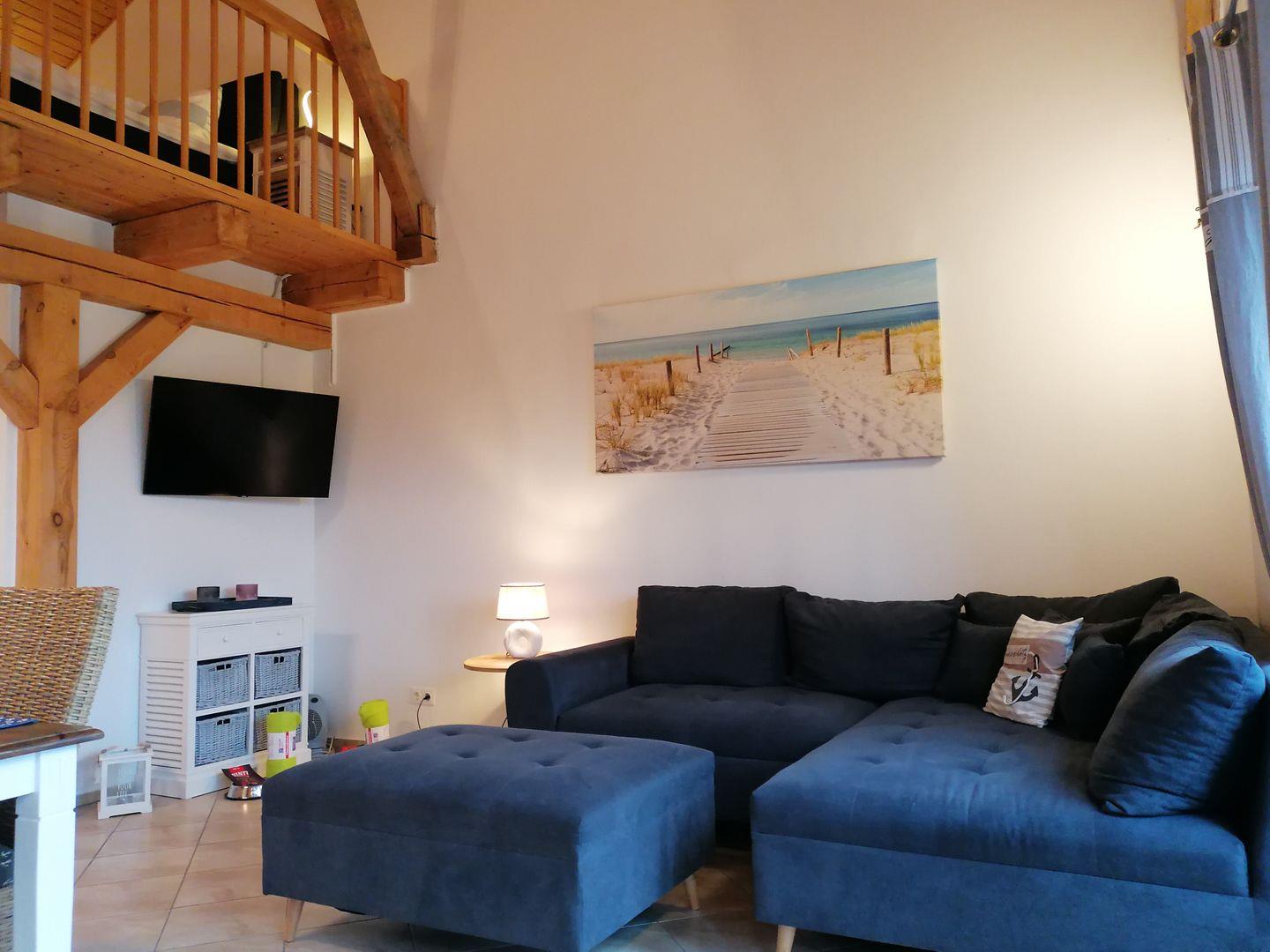 Im Erdgeschoss erwartet Sie der Wohn-Essbereich mit einer Eckcouch und Smart-TV, dazu eine vollausgestattete Küche und ein Bad mit Dusche. Über eine Holztreppe gelangen Sie nach oben in den gemütlichen Schlafbereich mit großem Boxspringbett (180x200) und einem Kleiderschrank.