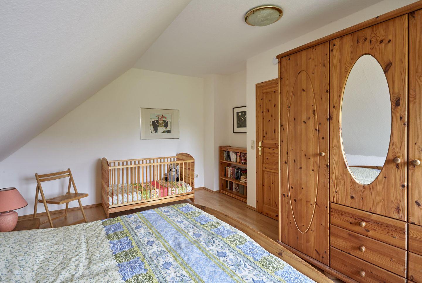 Im ersten Stock gibt es ein großes Schlafzimmer mit Doppelbett und kleinem Kinderbett, ein kleines Schlafzimmer mit Doppelbett und Liege sowie ein geräumiges Bad, in dem auch eine Waschmaschine steht. Im zweiten Stock befindet sich ein kleines Kinderzimmer mit zwei getrennten Betten im ausgebauten Spitzboden.