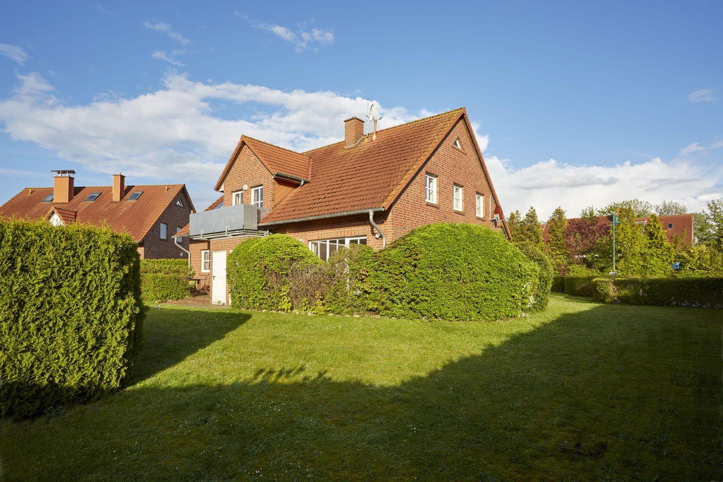 Diese Ferienwohnung verfügt im Erdgeschoss über einen großen Wohnraum mit Sitz- und Essecke, eine separate Küche, Gäste-WC und Abstellraum. Vom Wohnzimmer gelangt man auf die Sonnenterrasse, die mit Gartenmöbeln ausgestattet ist. Die zugehörige Gartenhälfte lädt zum Sonnenbaden ein. Sie ist von einer großen Hecke umgeben, sodass nicht jeder hineinschauen kann. Kinder freuen sich über den kleinen Sandkasten im Garten.
