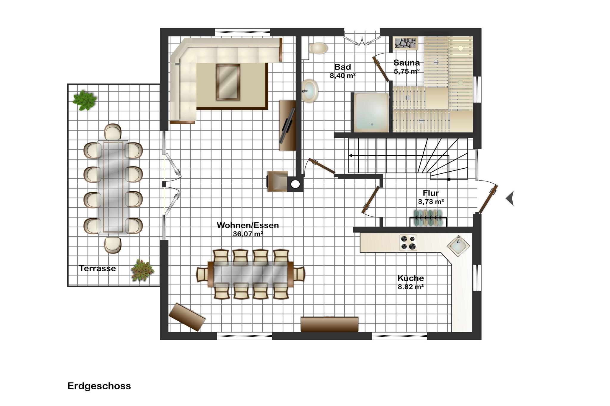 Stueetage: (åbent køkken(kogeplade(Komfur med fire kogeplader, induktion), elkedel, brødrister, emhætte, kaffemaskine, ovn, mikrobølgeovn, opvaskemaskine , køleskab(+ fryser)), stue / spisestue(Fjernsyn(fladskærm, parabol), spisebord(10 personer), pejs, sofahjørne, DVD-afspiller, radio, CD-afspiller), badeværelse(bruser(enhed, Walk-in-bruser), sauna, håndvask, toilet, føntørrer), Repos) På 1. etage: (soveværelse(dobbeltseng(180 x 200 cm), Fjernsyn(parabol), barneseng), soveværelse(dobbeltseng(180 x 200 cm), Fjernsyn(parabol)), soveværelse(dobbeltseng(180 x 200 cm), Fjernsyn(parabol)), badeværelse(badekar, bruser(enhed, Walk-in-bruser), 2x håndvask, toilet, føntørrer), Repos) På 2. etage: (soveværelse(enkeltseng, enkeltseng), soveværelse(dobbeltsovesofa, Fjernsyn(parabol), sofahjørne)) varme(gulvvarme), terrasse(privat), have(indhegnet), cykelopbevaring, havemøbler(10 personer), grill(elektrisk), parkering, parkering, parkering, Parasol, barnestol, Vaskeripakke mod et gebyr