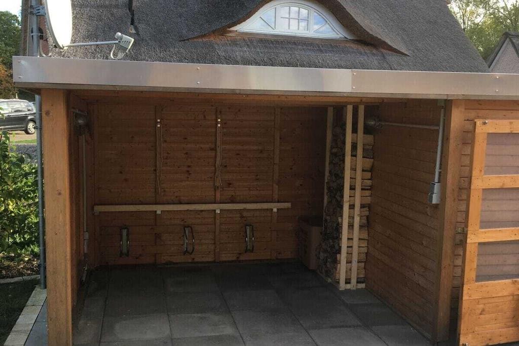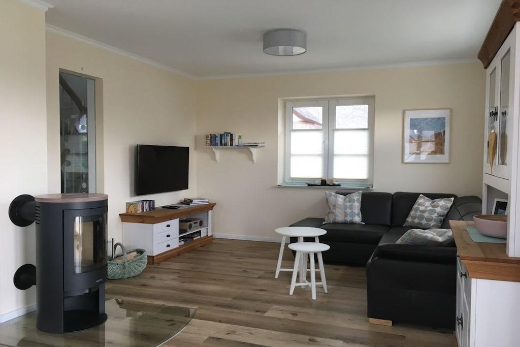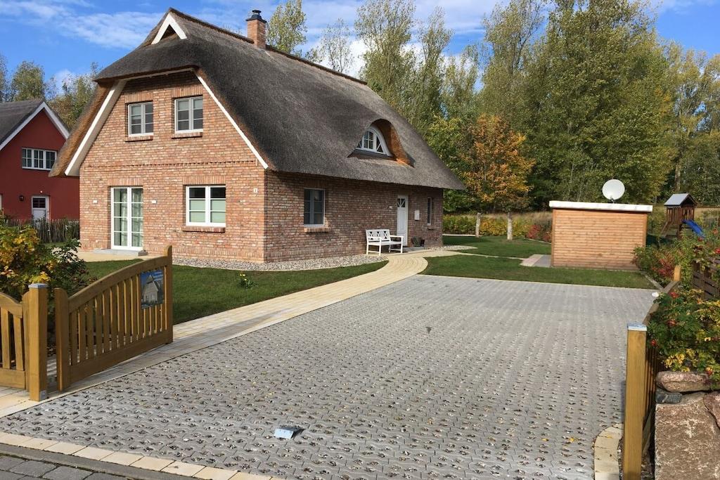 Unser wunderschönes Ferienhaus wurde 2018 fertig gestellt. Es präsentiert sich auf einer Wohnfläche von 110 Quadratmetern mit einem großzügigen und hellen Wohn-Ess-Bereich und offener Küche, zwei Badezimmern und drei Schlafzimmern. Die eindrucksvolle Außenfassade besteht aus historischen Ziegeln, die über 120 Jahre alt sind. Zusammen mit der Reeteindeckung und der Firstausbildung entsteht das für Mecklenburg regional typische harmonische Gesamtbild. Der Landhausstil setzt sich im inneren des Hauses fort. Die gesamte Einrichtung besticht durch Ihre Natürlichkeit und Farbwahl ohne auf das Moderne zu verzichten. Hier werden Sie erholsame Urlaubstage verbringen: Während die Kinder im Garten toben, entspannen Sie im Strandkorb oder an kalten Tagen in unserer Sauna oder am Kaminofen.