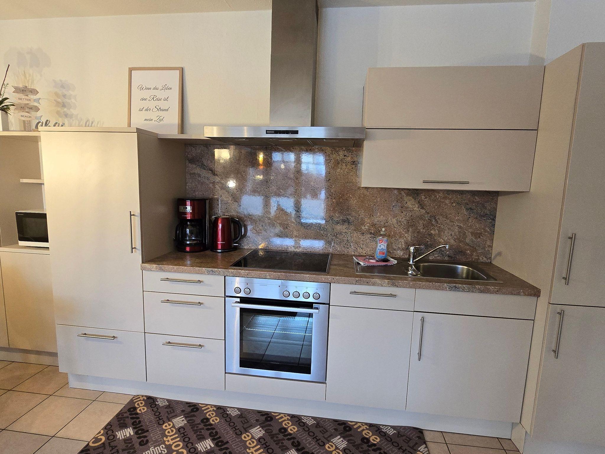 Die gemütliche Ferienwohnung verfügt über einen offenen Wohn- und Küchenbereich mit integrierter Küche, einem Schlafzimmer mit einem Doppelbett (die Maße sind 1,60 m + 2,00m ) und im Wohnzimmer ist eine ausziehbare Schlafcouch (Maße 1,60 m x 2,00 m) sowei ein Badezimmer mit Dusche und WC.