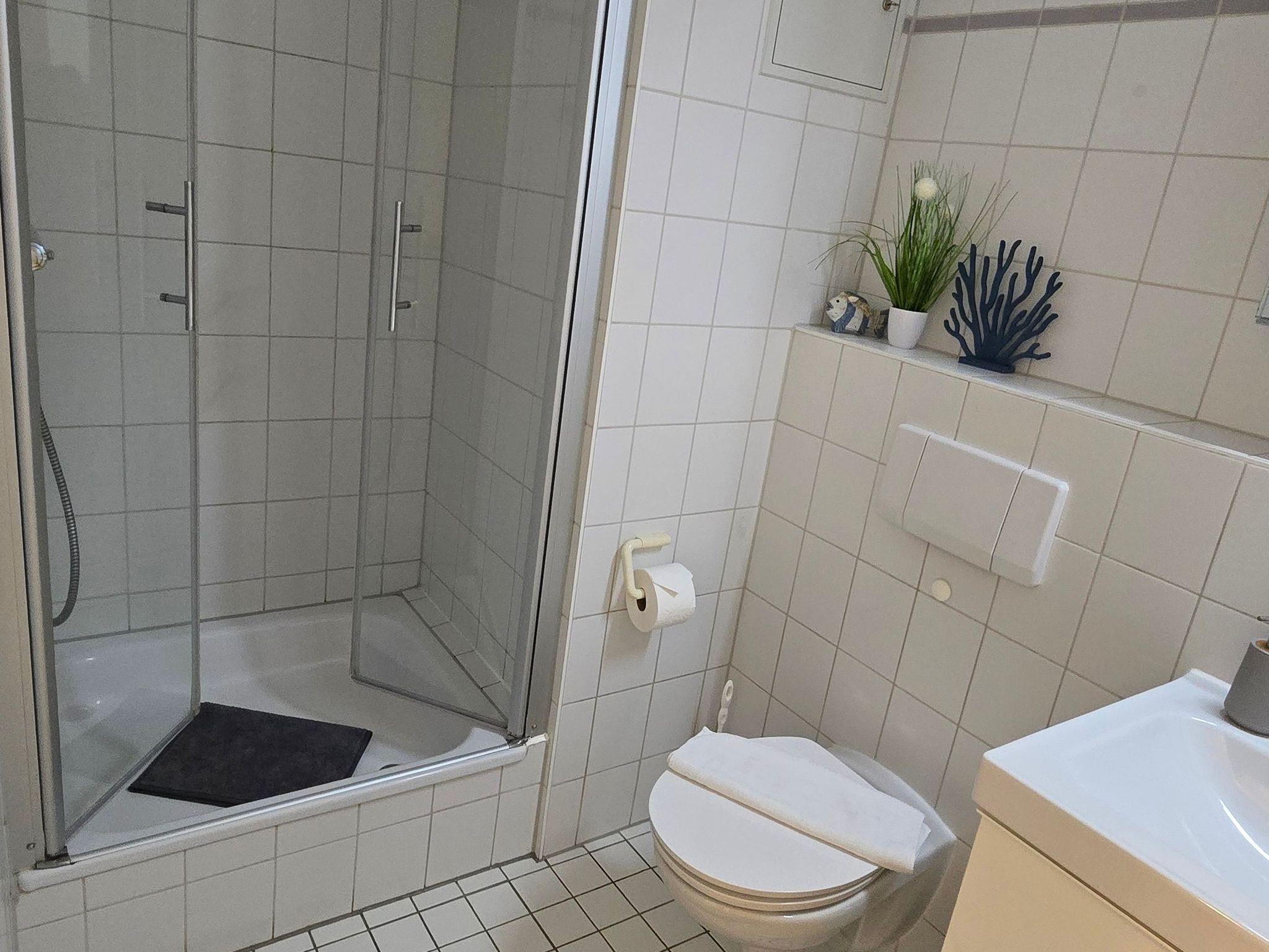 Das Badezimmer verfügt über eine Dusche mit einem WC.
