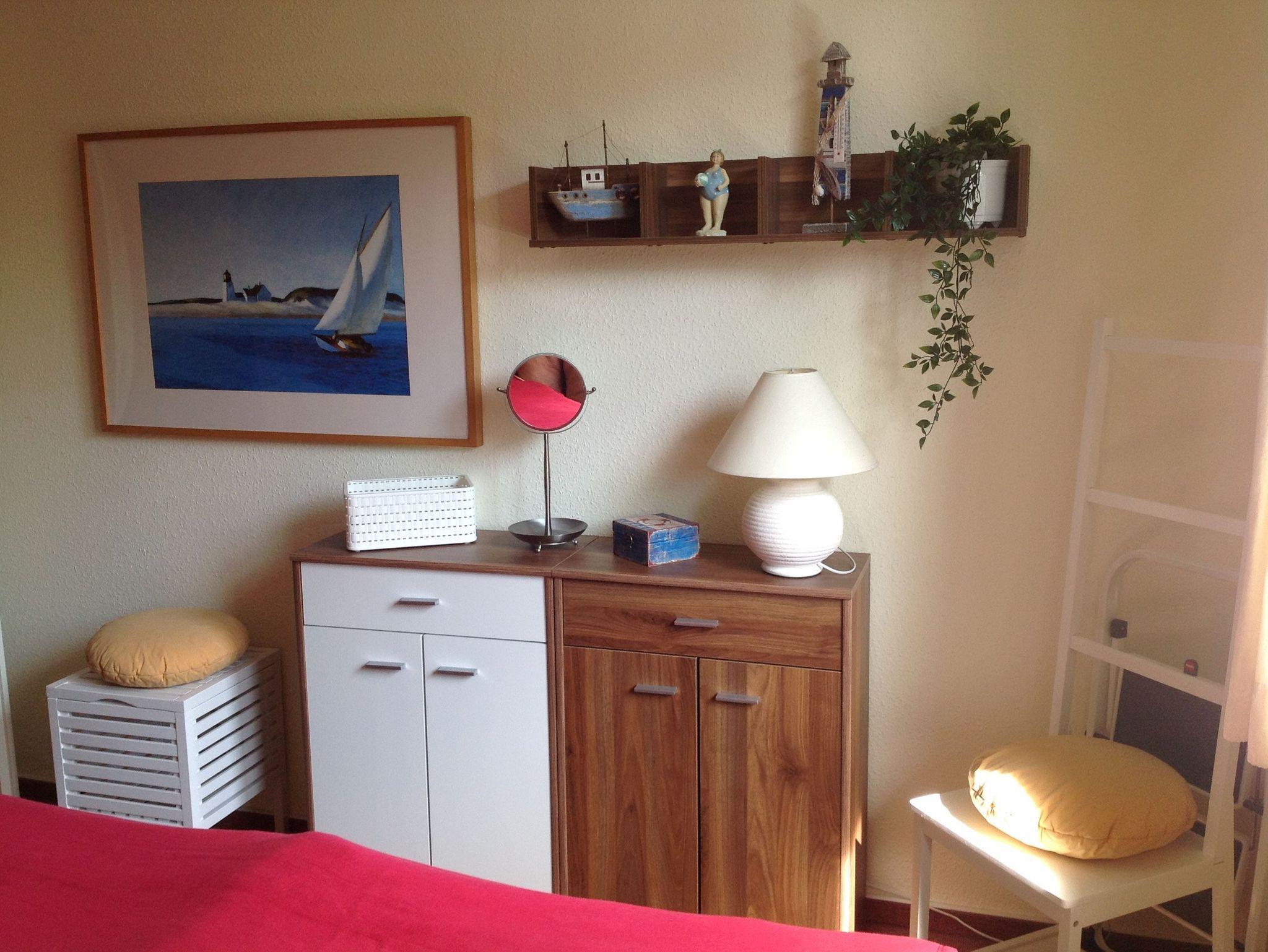 Im Schlafzimmer mit großzügigem Schrank (mit Safe) und 2 Sideboards können die Urlaubssachen und Koffer verstaut werden. Außerdem sind im Schrank auch ein Kinderhochstuhl und Kinderreisebett vorhanden. Das Doppelbett ist mit höhenverstellbaren Lattenrosten und komfortablen Matratzen ausgestattet
