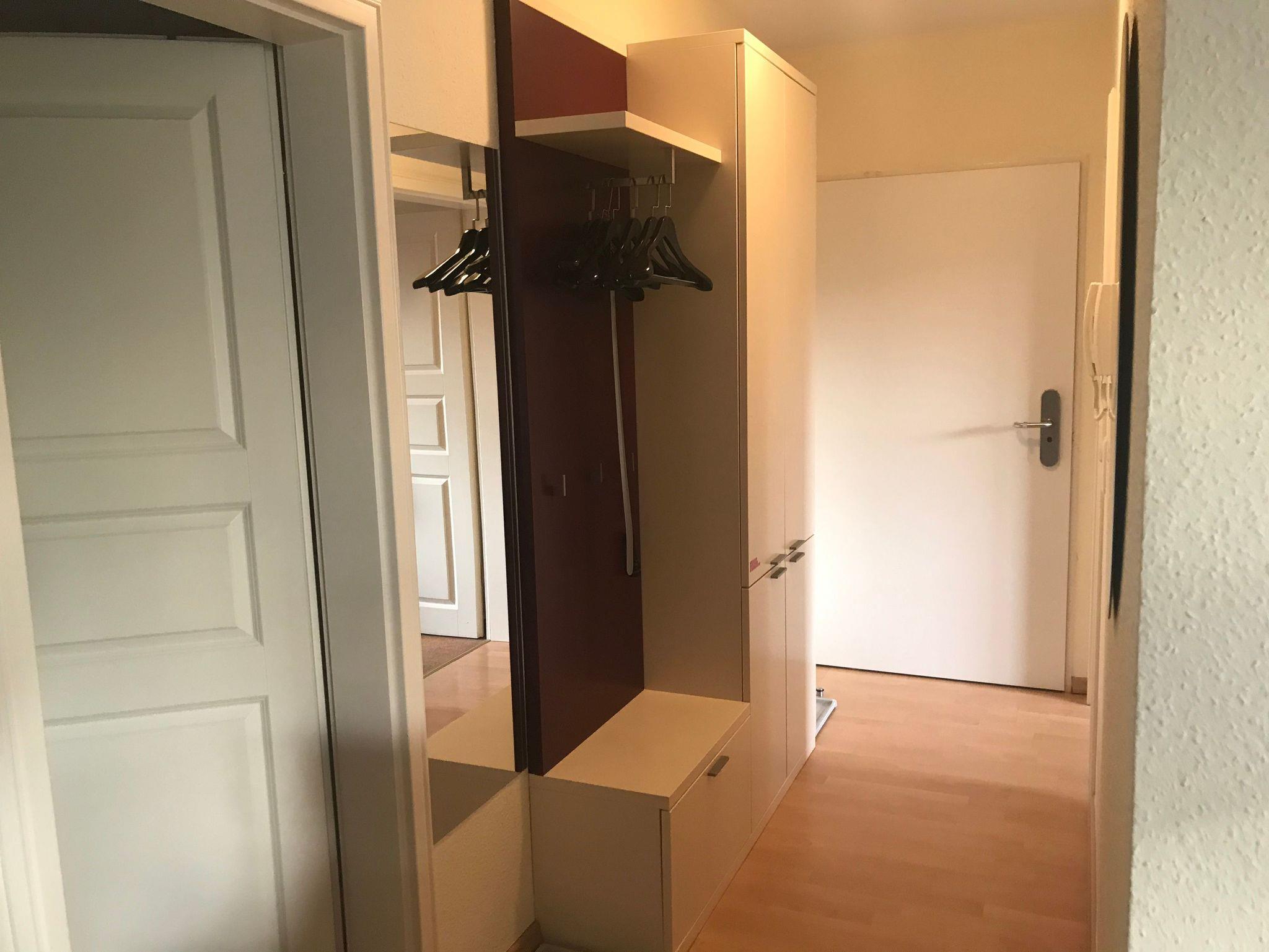 In der Flurgarderobe befindet sich, wenn man es benötigt, Staubsauger, Besen und Schrubber. Das Badezimmer mit Dusche und WC, Regal und großem Spiegel vervollständigt das Ganze.