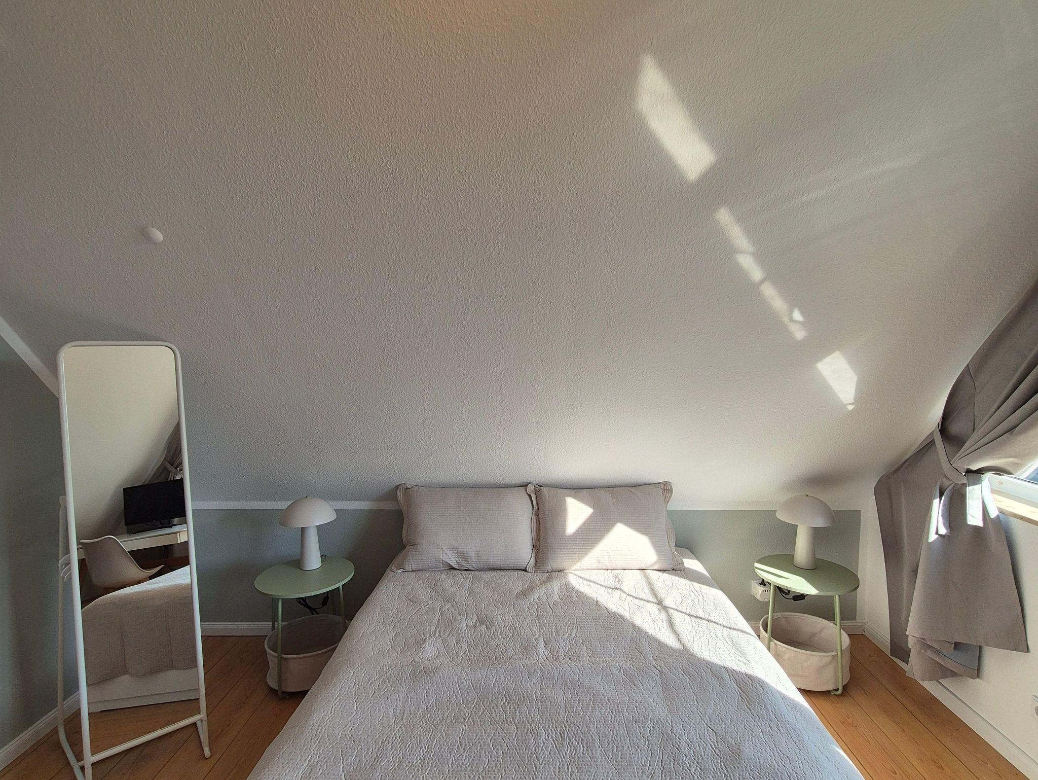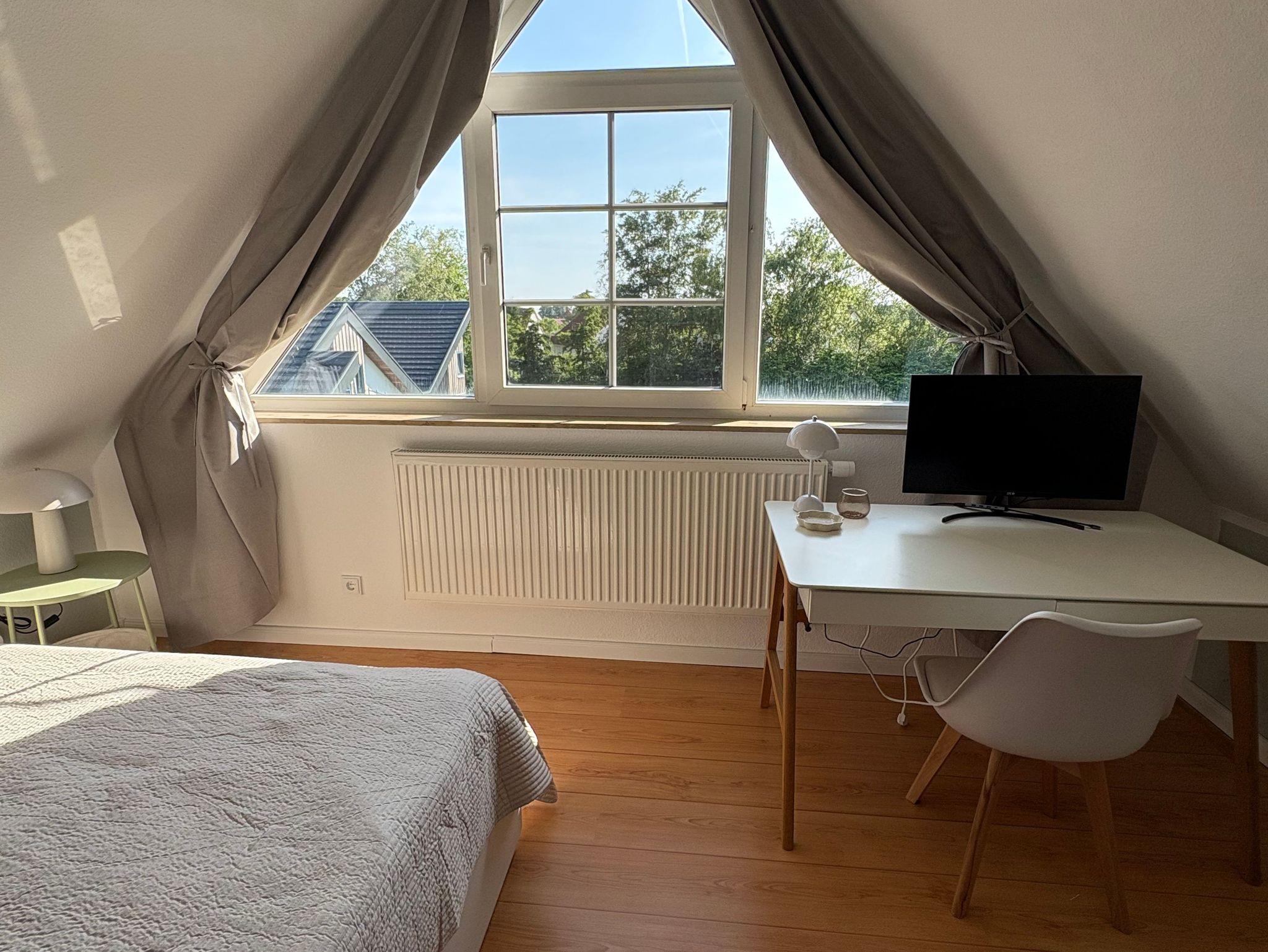 Im geräumigen, durch eine Wendeltreppe erreichbaren Giebelzimmer befindet sich ein Doppelbett (160 x 200 cm), eine gemütliche Leseecke sowie ein Schreibtisch und Smart-Bildschirm, der sich auch für Homeoffice und Workation bestens eignet.