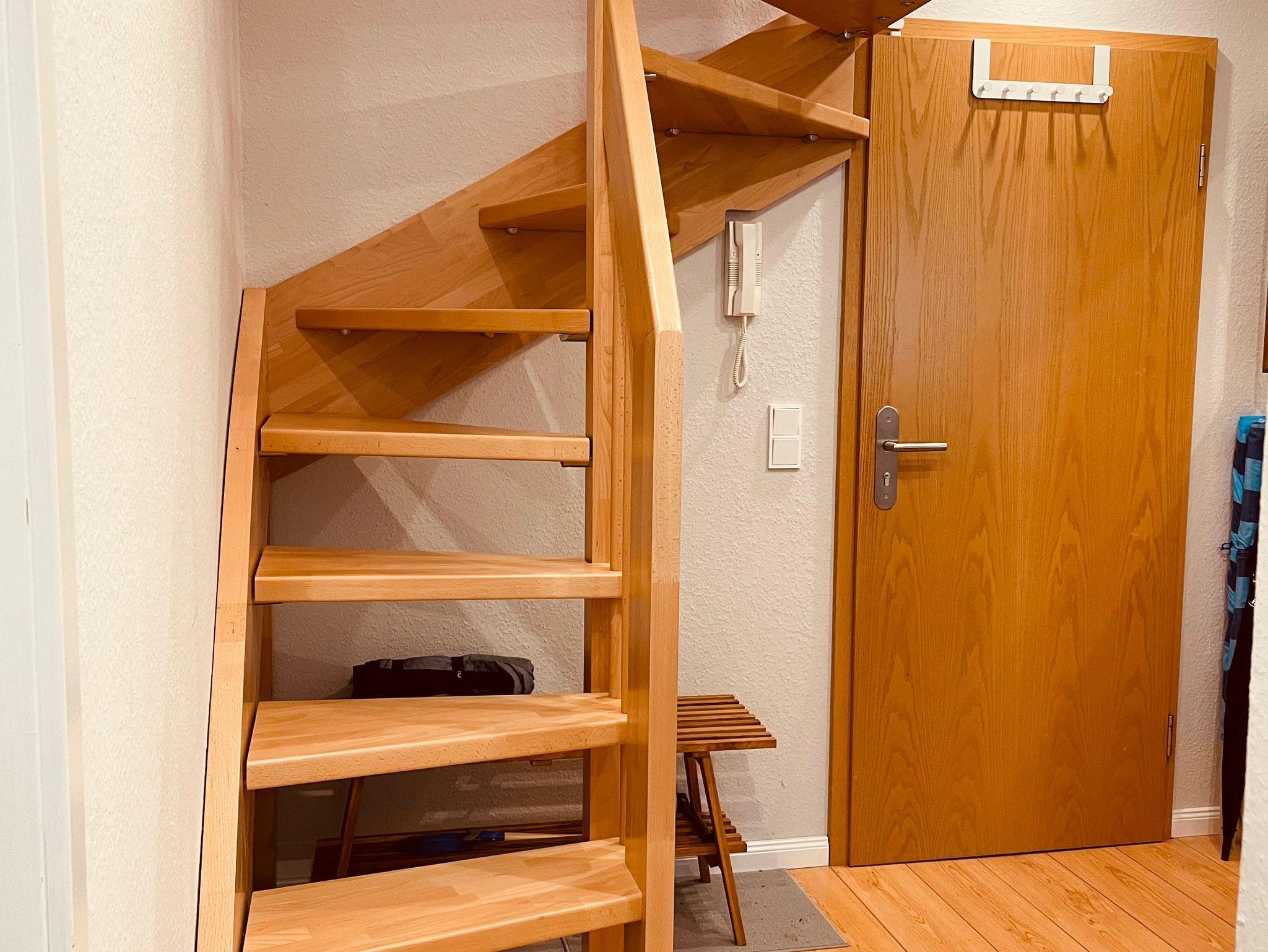 Das obere Stockwerk ist über eine schmale Treppe zu erreichen, deren Benutzung auf eigene Gefahr erfolgt. Der Treppenschutz für Kleinkinder ist nach bestem Wissen und Gewissen installiert, die Benutzung erfolgt auf eigene Gefahr, eine Haftung wird nicht übernommen.